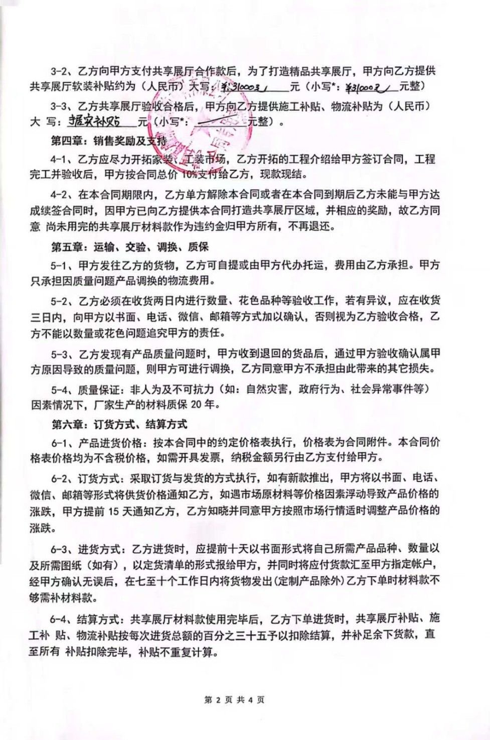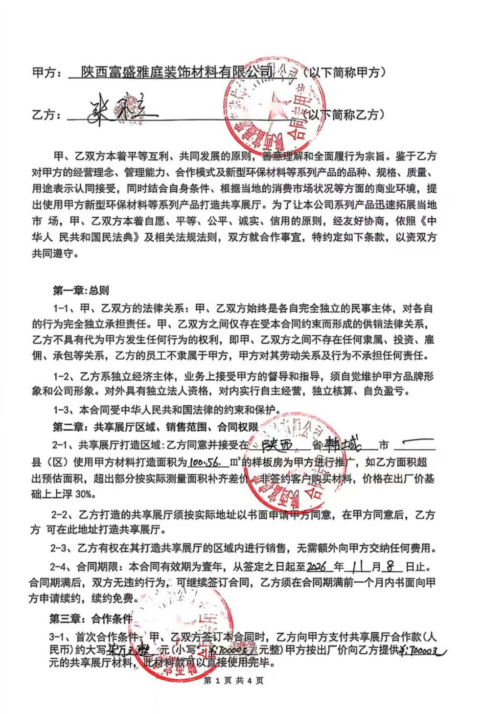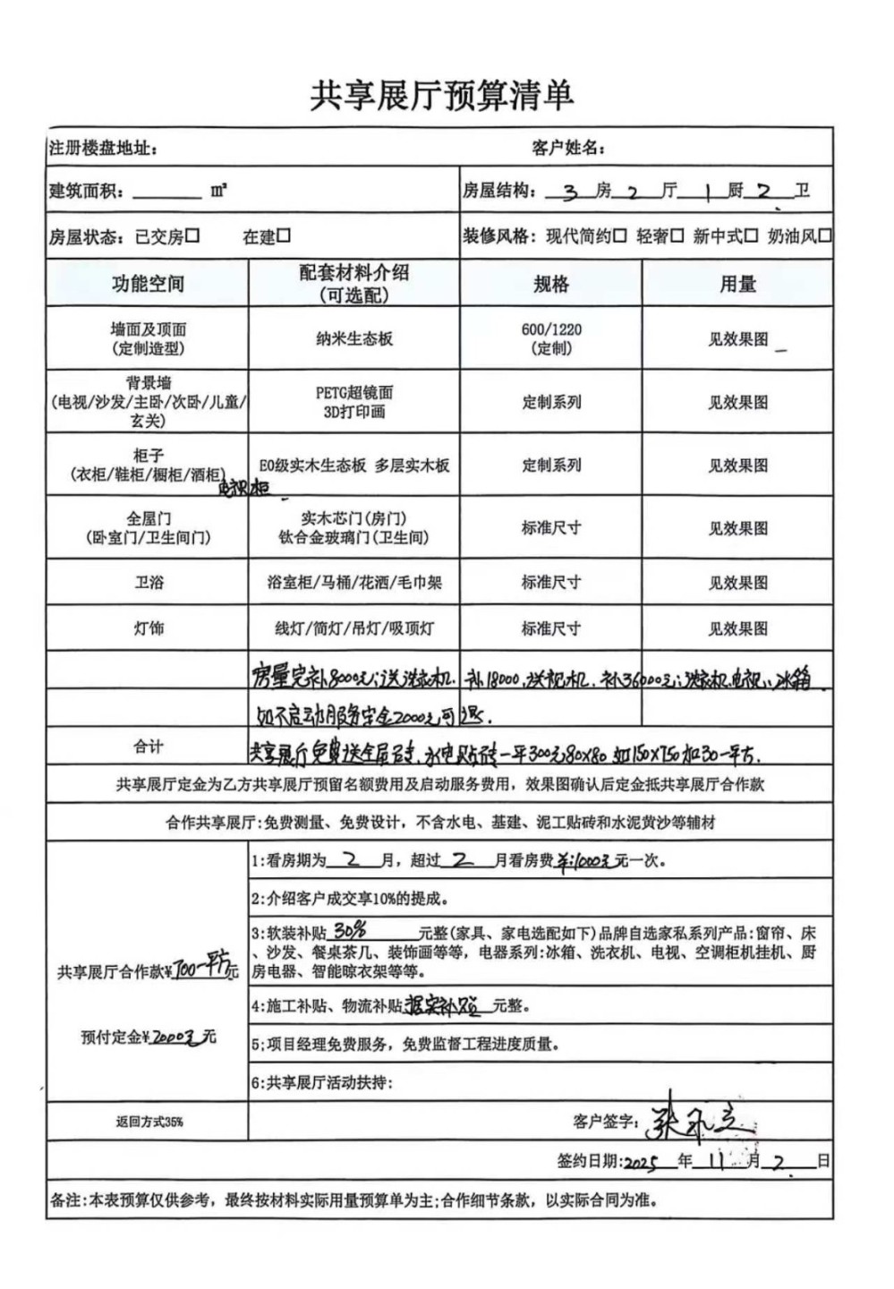 1. 签约与付款:我在抖音看到其“样板间全屋整装”广告后,与该公司签订合同。目前已累计支付该厂家65000元。签约前该公司承诺700元/平方,测量面积为100㎡,合同款70000元,在此基础上可获得30%的软装补贴,加上量完房后补缴36000元,额外获得10000元软装、电器补贴。