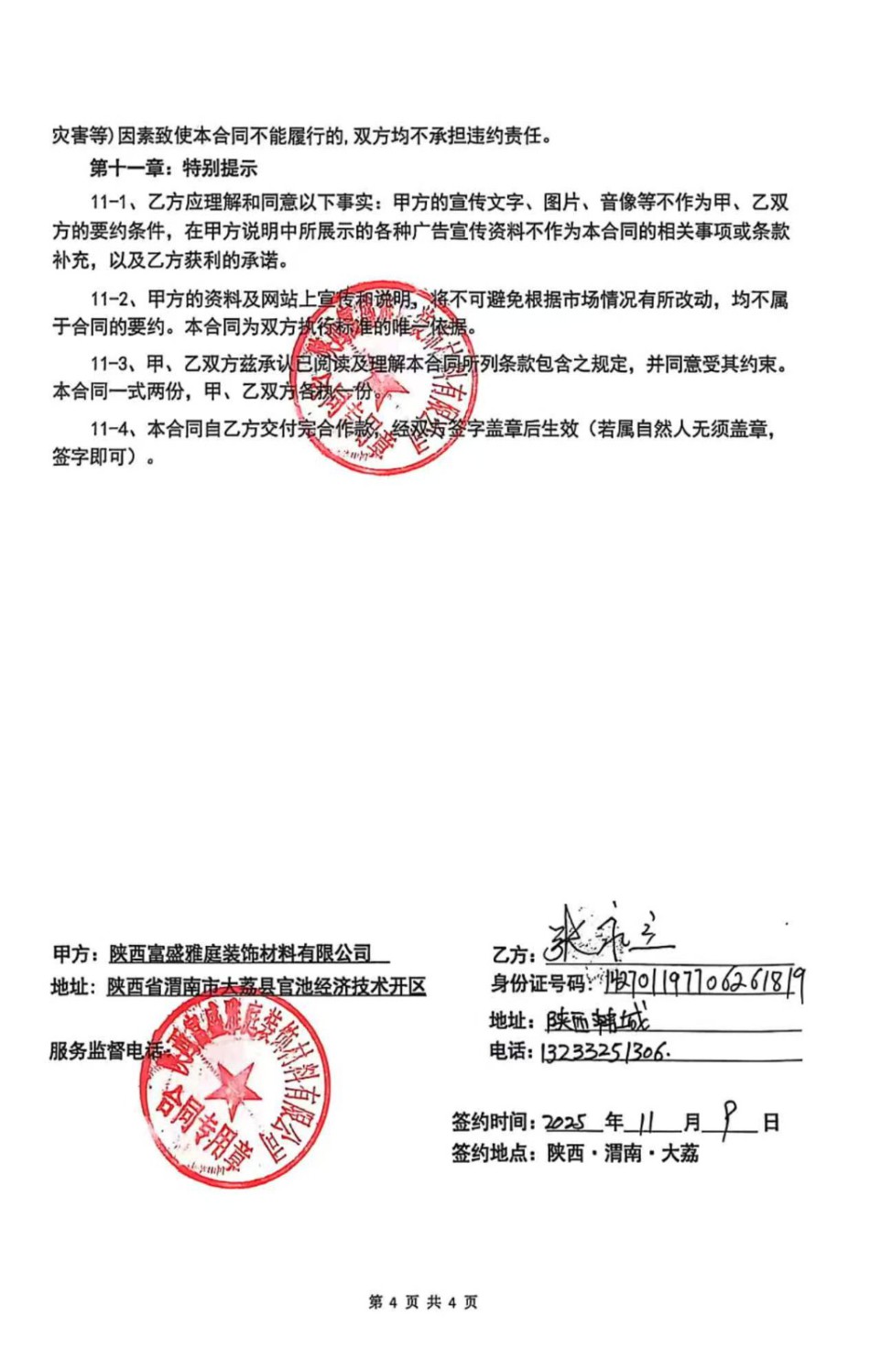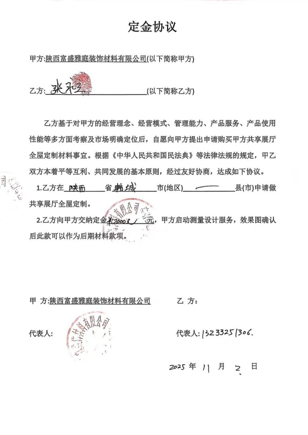 我是陕西省韩城市的一位业主,在2025年11月与“陕西富盛雅庭装饰材料有限公司”(注册地:陕西渭南大荔县)签订了装修合同。现在遭遇了严重的合同纠纷,该公司存在诱导消费、恶意增项、承诺不兑现等问题,恳请平台介入调解。