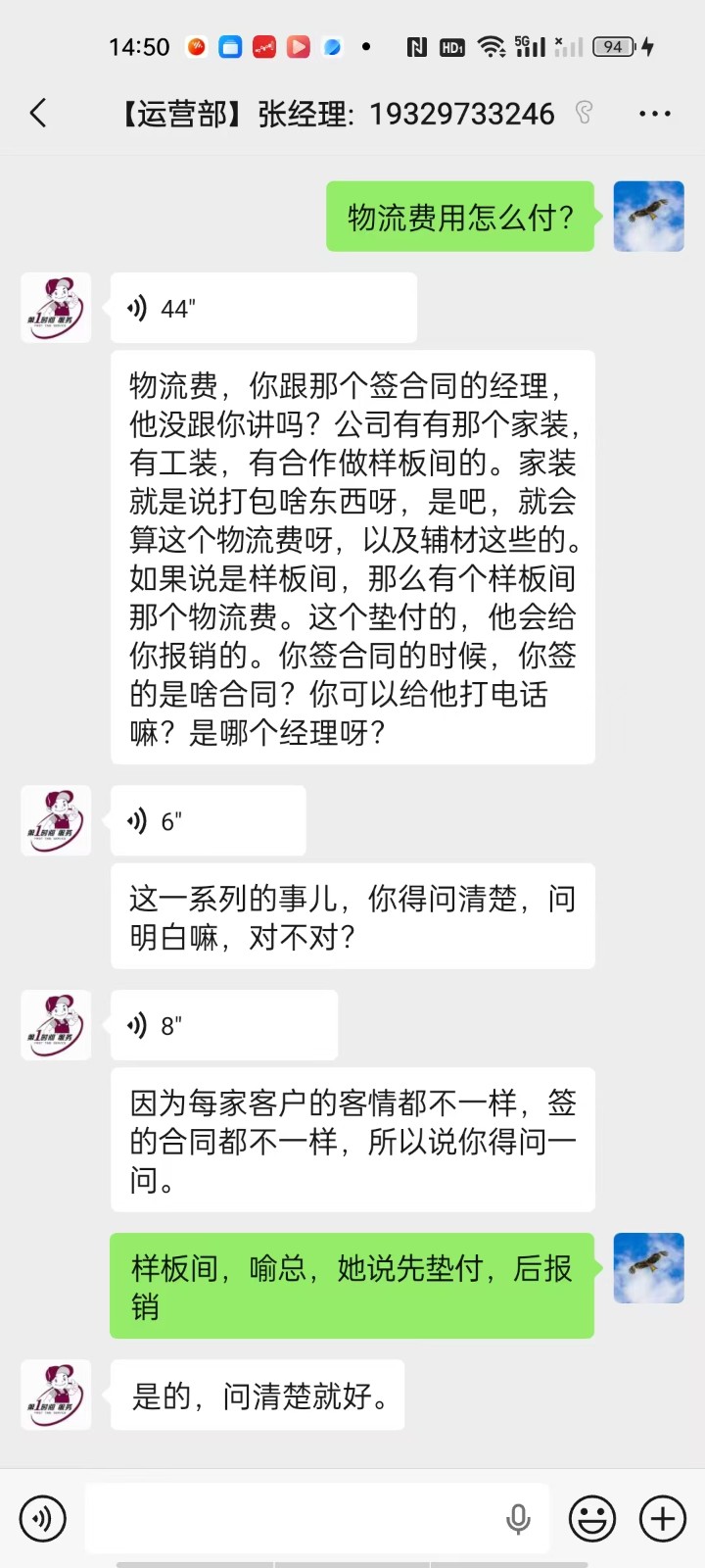 2. 物流费、上楼费、辅材费、施工费垫付:公司要求我先垫付物25003元(具体见转账截屏),收款方为私人或物流公司,对方承诺“完工后统一报销”。目前该厂家答复不能据实报销。