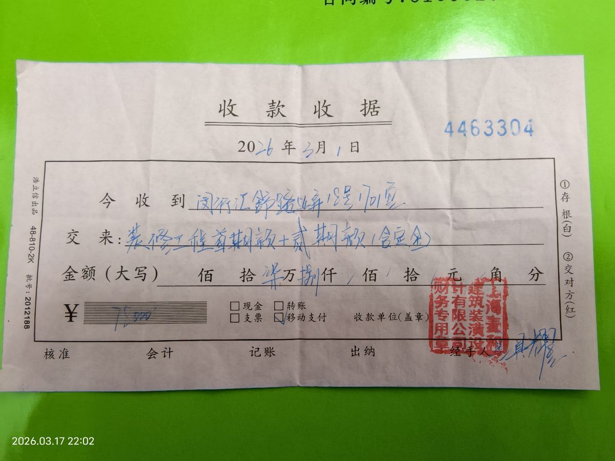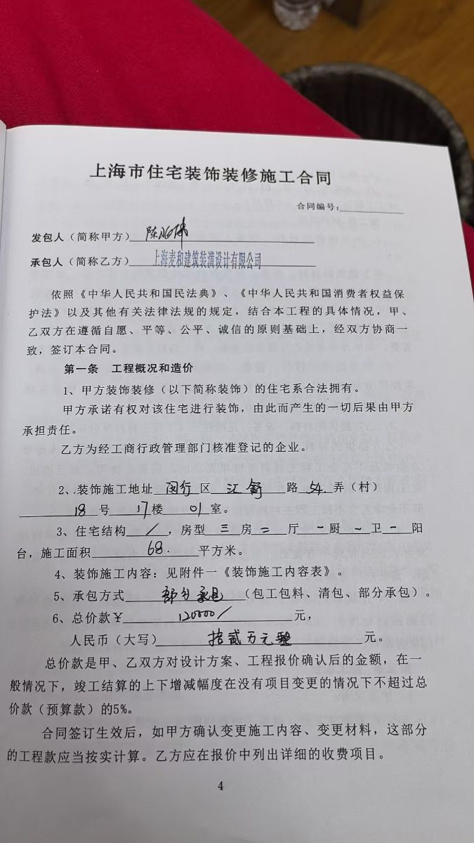 2025年,我爱人(陈兆伟)在齐家网了解到上海麦和建筑装潢设计有限公司,于是我们约设计师上门量房、出报价,然后在2025年12月27日,去现场签了装修合同(签订合同当天支付了5000元订金)