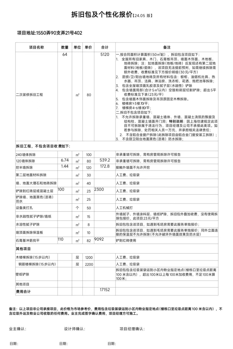 原合同报价只含铲到腻子,产完说是空包需要再铲到红砖,增项价格如下图。