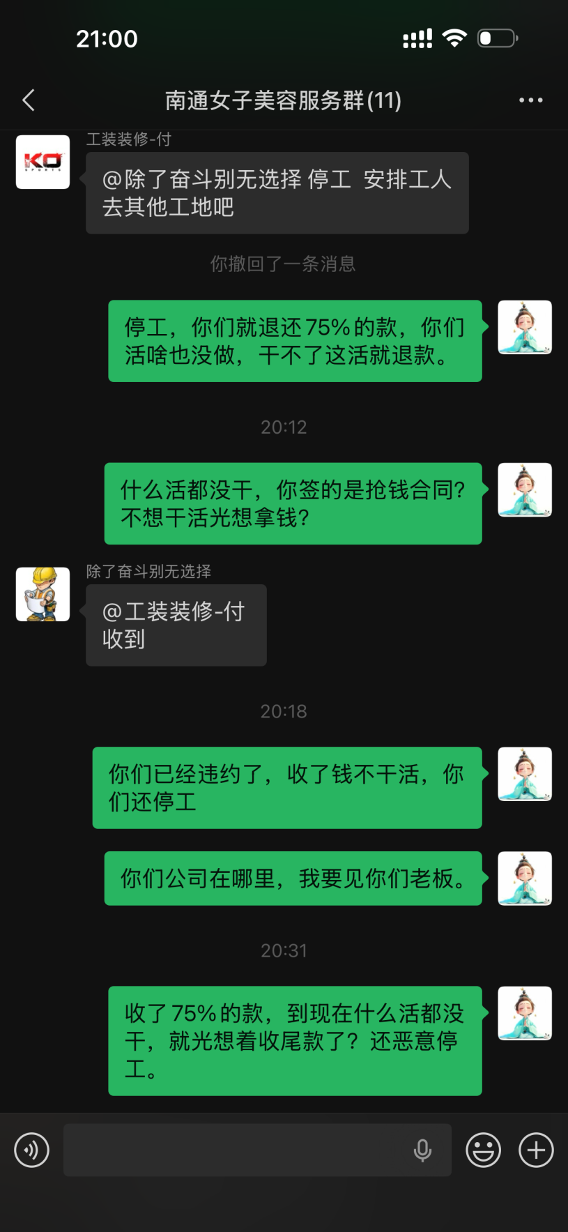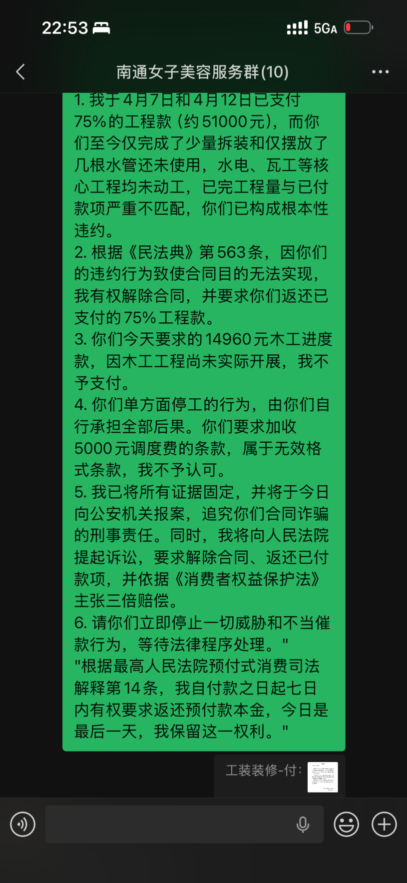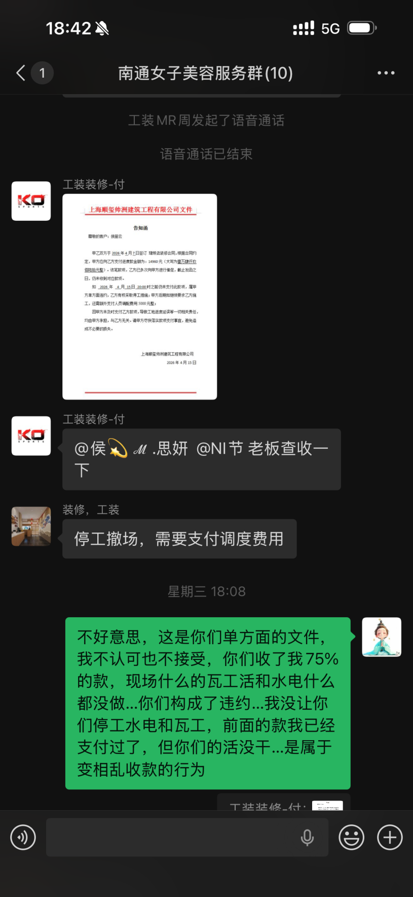 签约当日,合同约定本人支付合同总价的30%作为首付款,4月12号支付45%作为水电施工,本人通过扫码方式向被投诉方已支付了75%的款约51000元。然而,被投诉方收到75%首付款后,被投诉方进场后少量拆装和几根水管的铺设,水电工程未完成、瓦工未动工、墙未切,实际完成的工程量与已支付的75%首付款严重不匹配。105平米装修仅给15天工期,装修行业根本无法完成。报价单大量使用“不含”“另计”“多退少补”等模糊表述,故意遗漏防水、找平等必要项目,为后期恶意增项预留空间。仅完成极少量施工作为“障眼法”,部分履行诱骗继续付款。 2026年4月14日,被投诉方随即以“木工材料进场”为由,要求本人再支付14,960元,并发《告知函》威胁:如不付款就停工,后续继续施工还需加收5,000元人员调度费。本人拒绝支付后,被投诉方于4月15日擅自停工,并明确要求“停工安排工人去其他工地”。