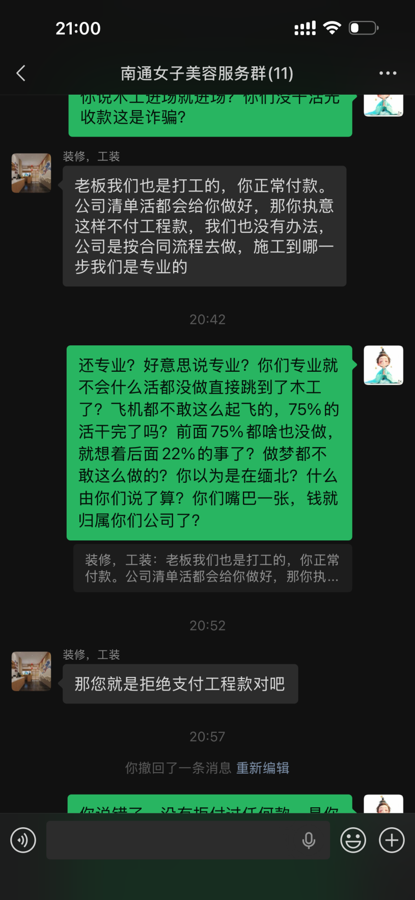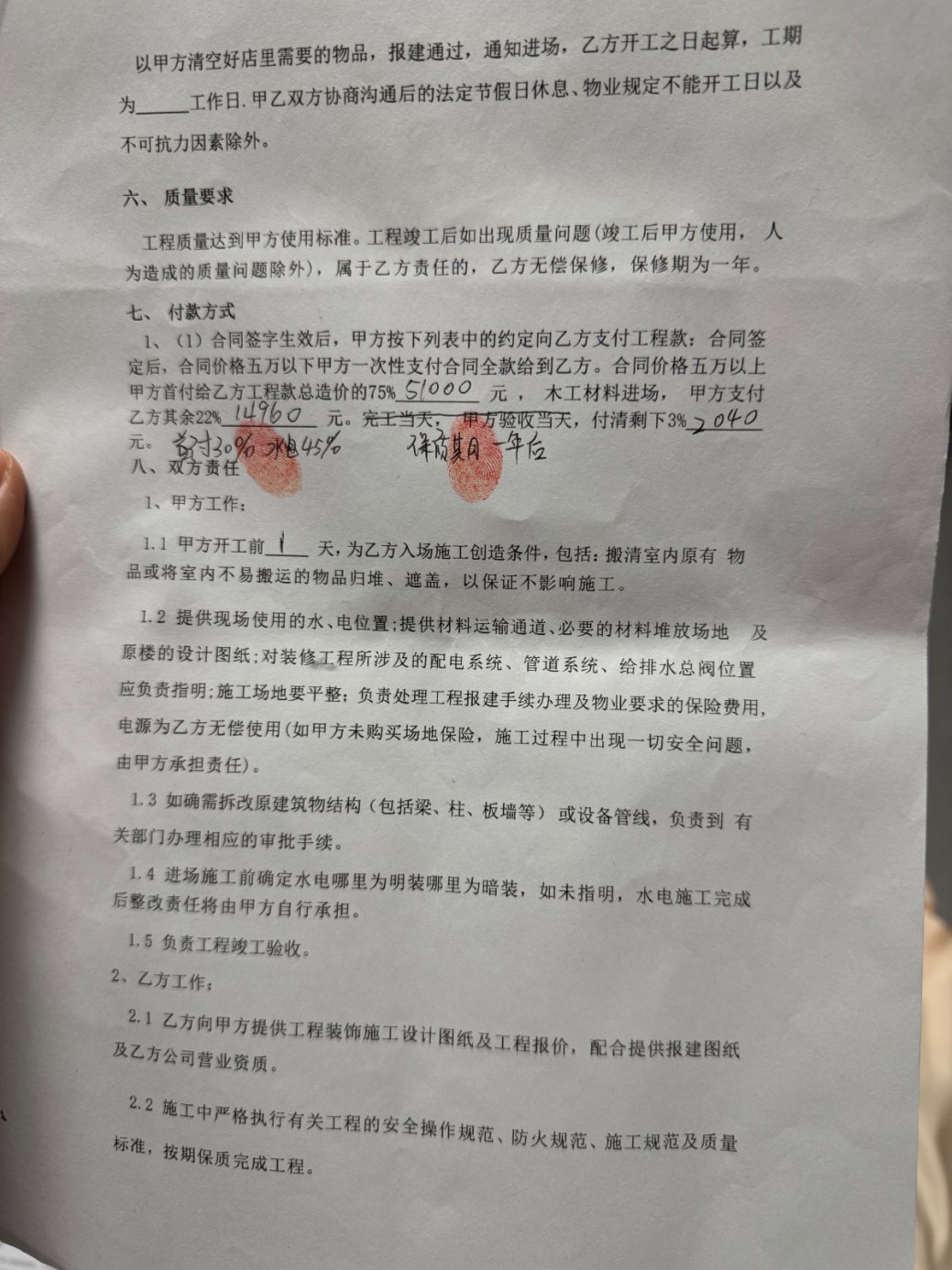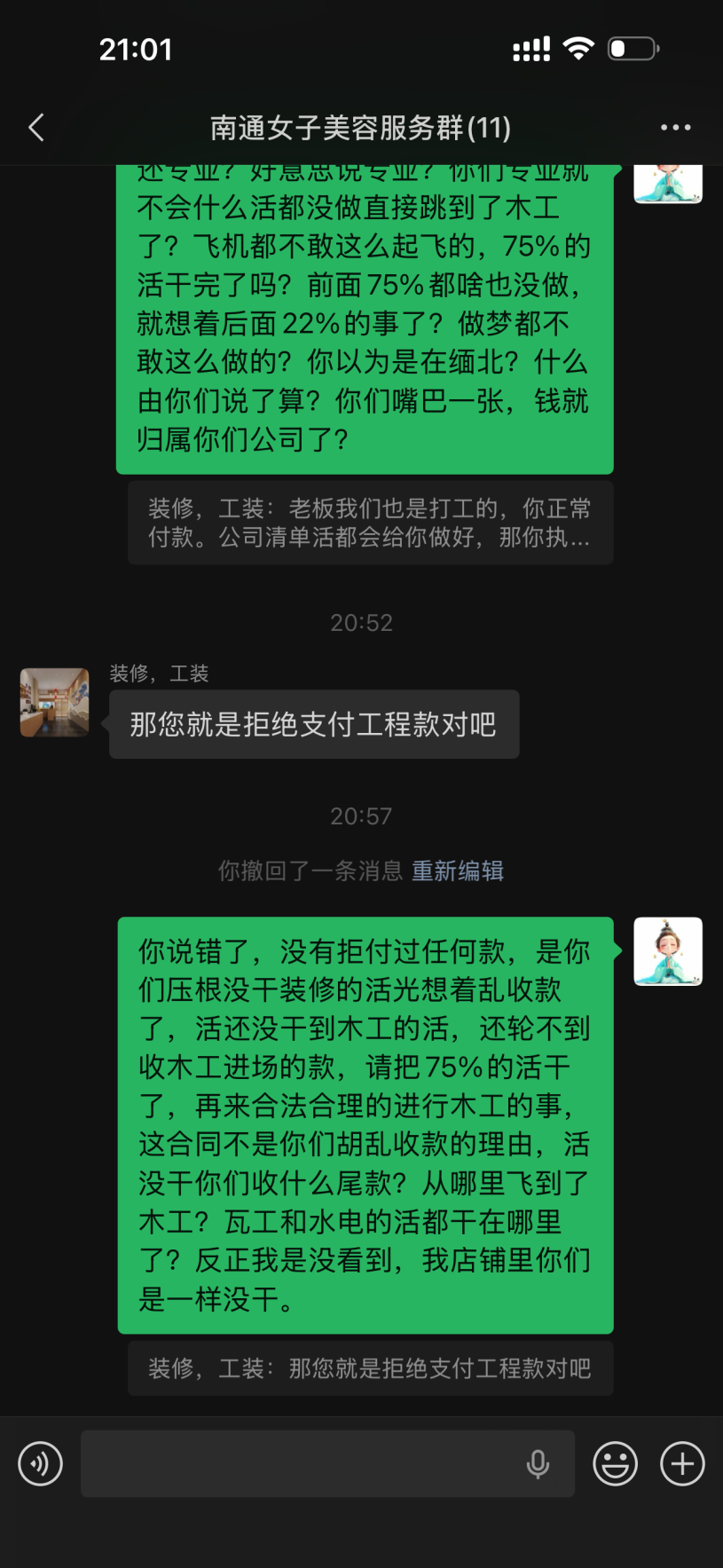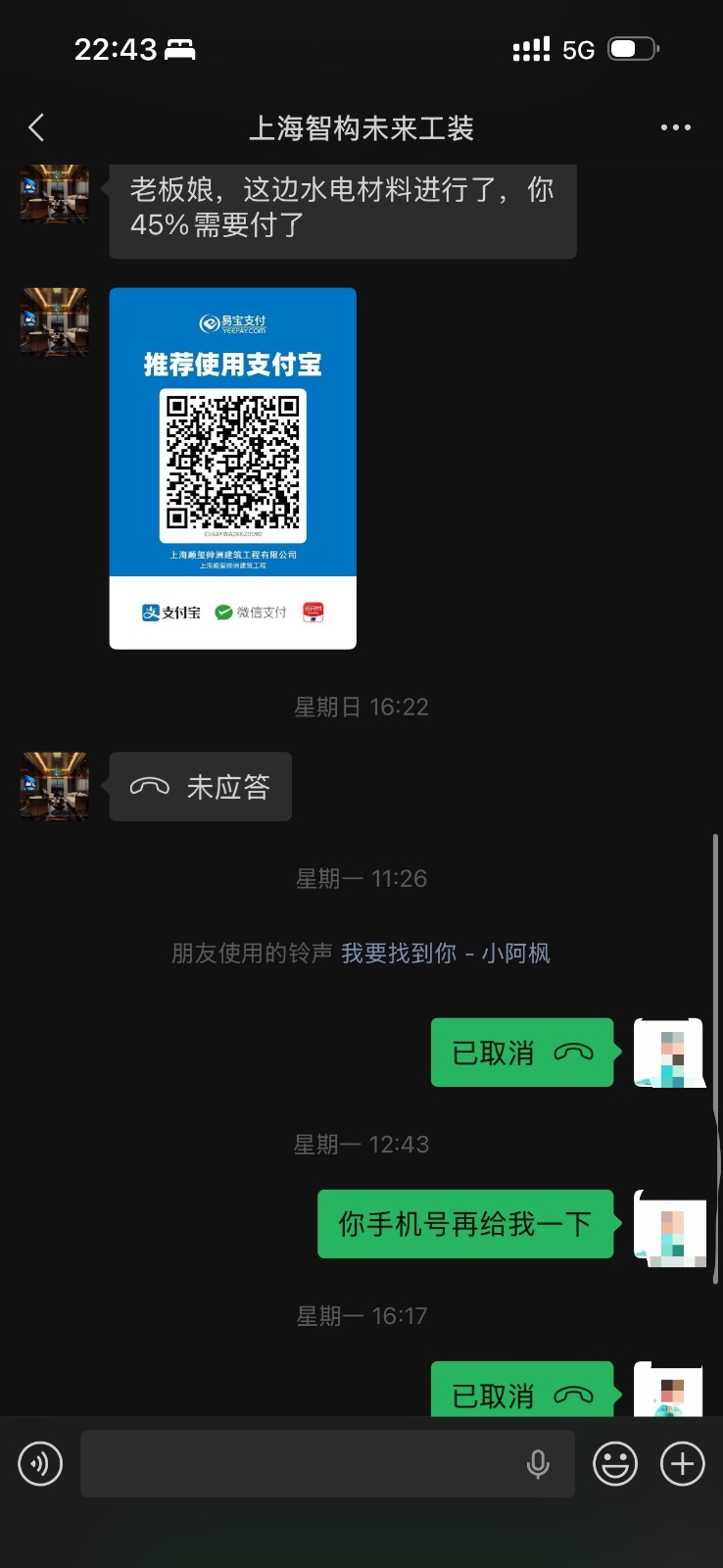 签约当日,合同约定本人支付合同总价的30%作为首付款,4月12号支付45%作为水电施工,本人通过扫码方式向被投诉方已支付了75%的款约51000元。然而,被投诉方收到75%首付款后,被投诉方进场后少量拆装和几根水管的铺设,水电工程未完成、瓦工未动工、墙未切,实际完成的工程量与已支付的75%首付款严重不匹配。105平米装修仅给15天工期,装修行业根本无法完成。报价单大量使用“不含”“另计”“多退少补”等模糊表述,故意遗漏防水、找平等必要项目,为后期恶意增项预留空间。仅完成极少量施工作为“障眼法”,部分履行诱骗继续付款。 2026年4月14日,被投诉方随即以“木工材料进场”为由,要求本人再支付14,960元,并发《告知函》威胁:如不付款就停工,后续继续施工还需加收5,000元人员调度费。本人拒绝支付后,被投诉方于4月15日擅自停工,并明确要求“停工安排工人去其他工地”。