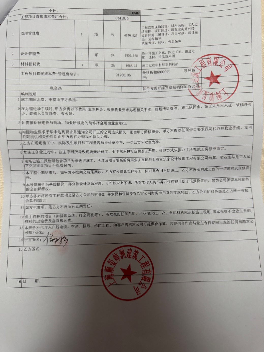 合同约定“已签订合同项目如没有现场无法施工项目不可减项”,甲方要求减项即便材料未进场也需承担合同规定的管理费用,严重剥夺消费者的合同变更权利。合同中还约定甲方未经乙方同意在社交平台发布信息,乙方有权向甲方追偿2万元及相关律师费、诉讼费等,严重限制消费者正当维权等不合理条款。