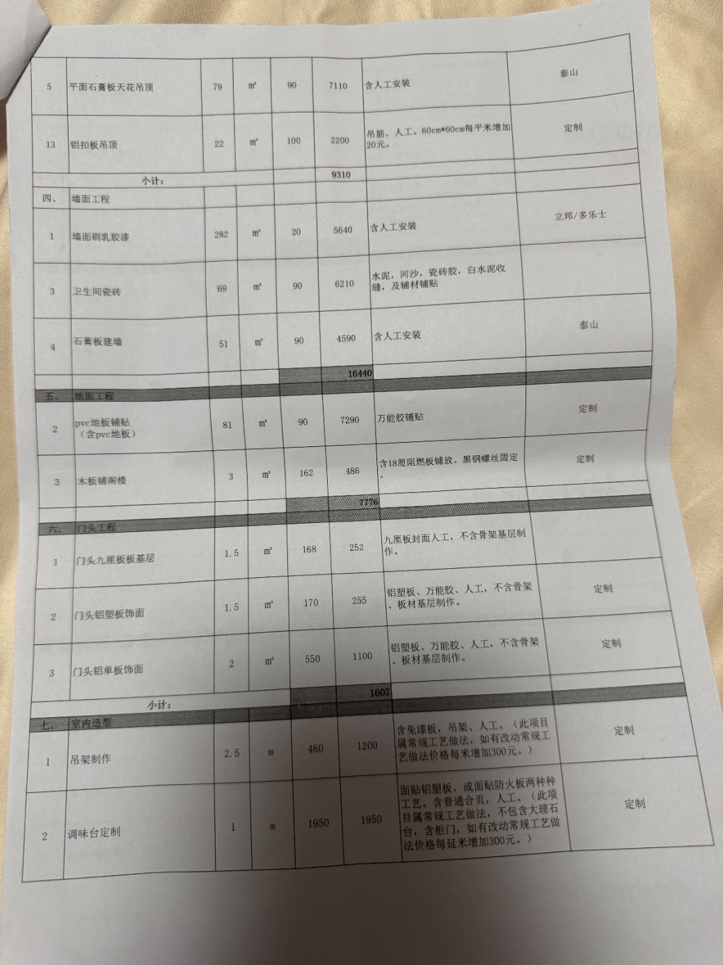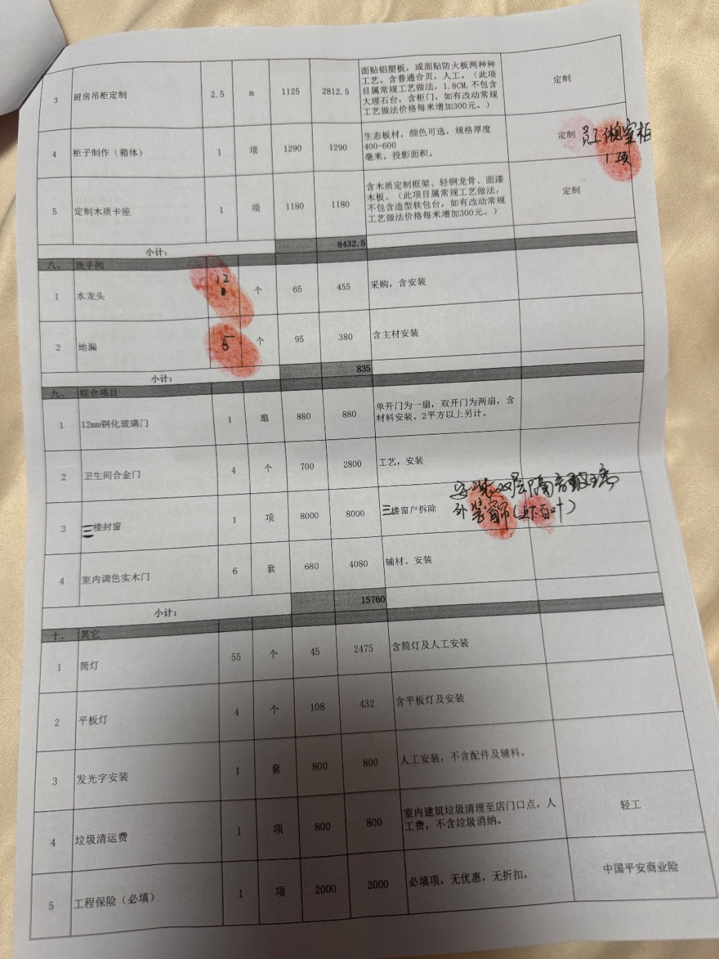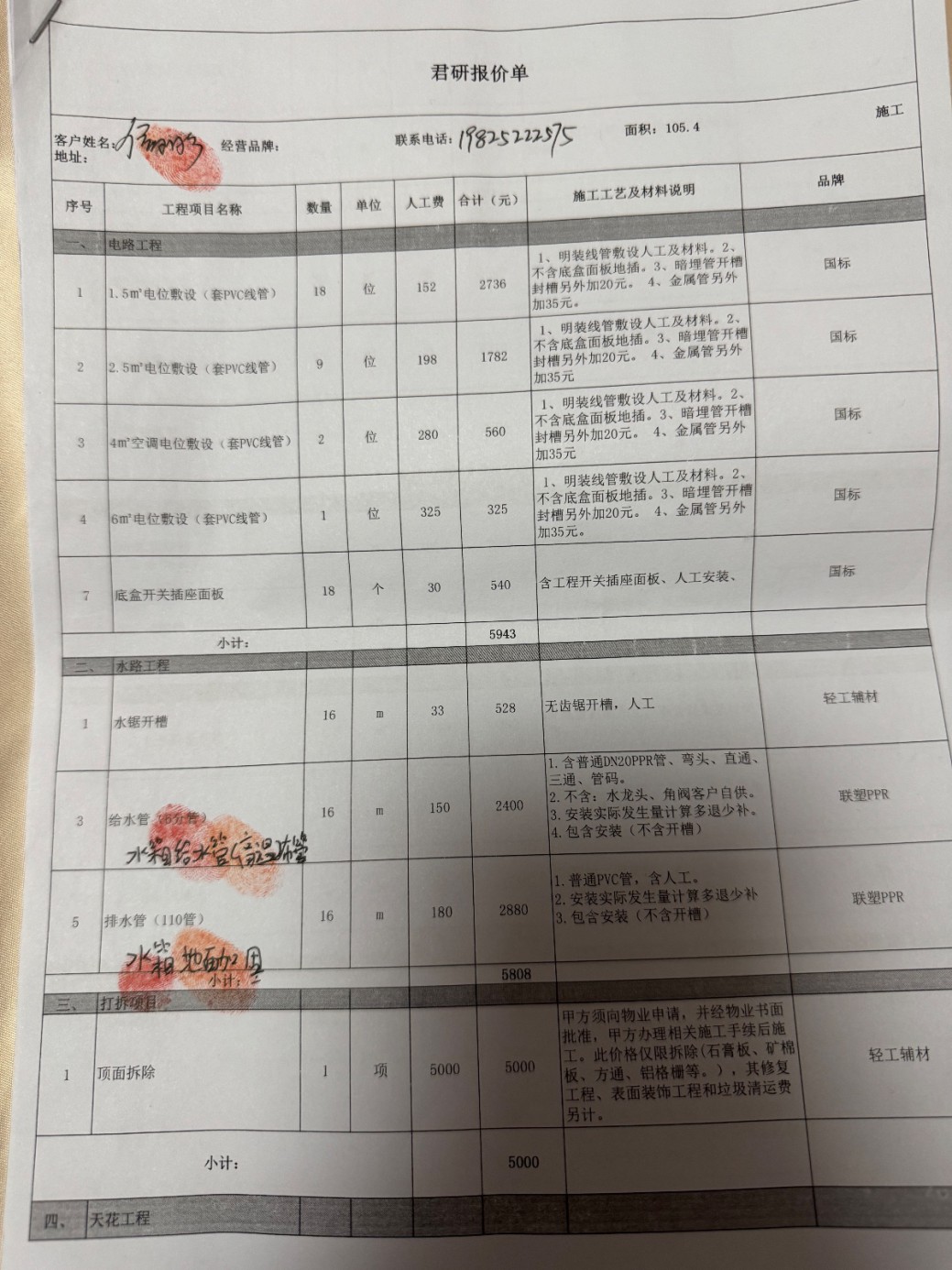 被投诉方的《报价单》中大量使用“不含”“另计”“多退少补”等模糊表述,故意隐瞒真实价格构成,例如:电路工程“不含底盒面板地插”“暗埋管开槽封槽另外加20元”;水路工程“不含水龙头、角阀等户自供”“安装实际发生量计算多退少补”;打拆项目“其修复工程、表面装饰工程和垃圾清运费另计”;门头工程“不含骨架基层制作”。防水工程、墙面地面找平、强弱电箱等必要项目在报价单中完全没有列出,构成故意漏项。