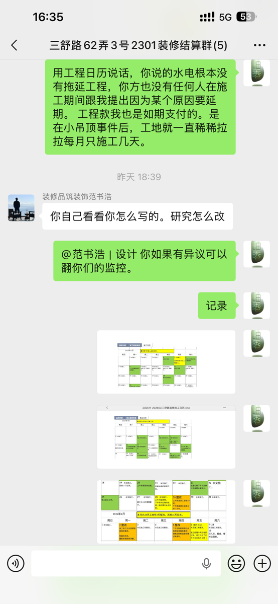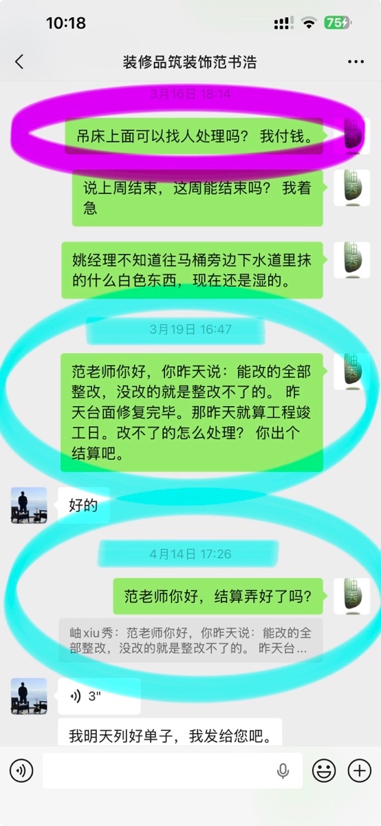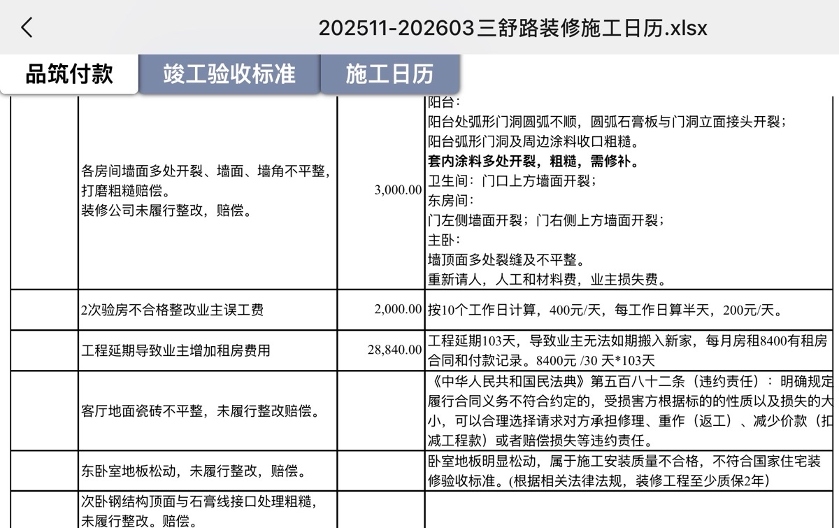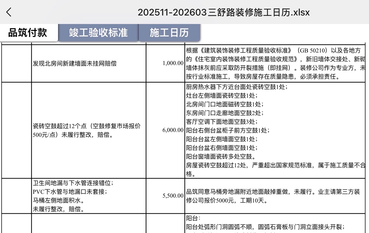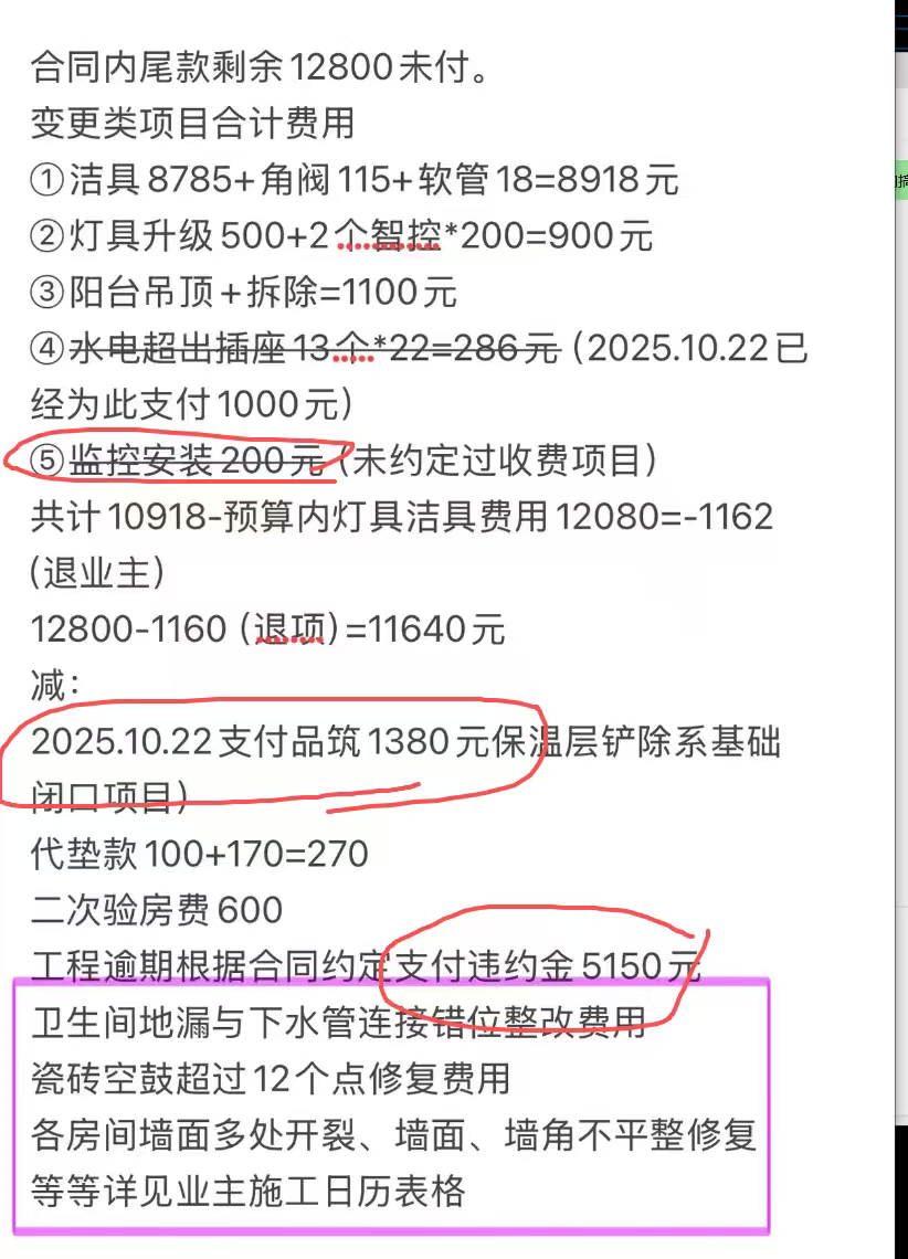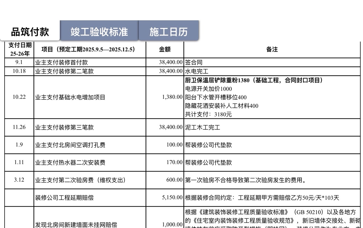 2026.4.15晚上收到范书浩结算项目,其就现场未处理好项目补偿业主1000元;业主也向其出示“施工日历”,包括业主向上海品筑质铭装饰工程有限公司四次付款的时间截点和金额及根据市场价装修不合格部分修复费用及工程延期按照合同约定补偿等诉求。