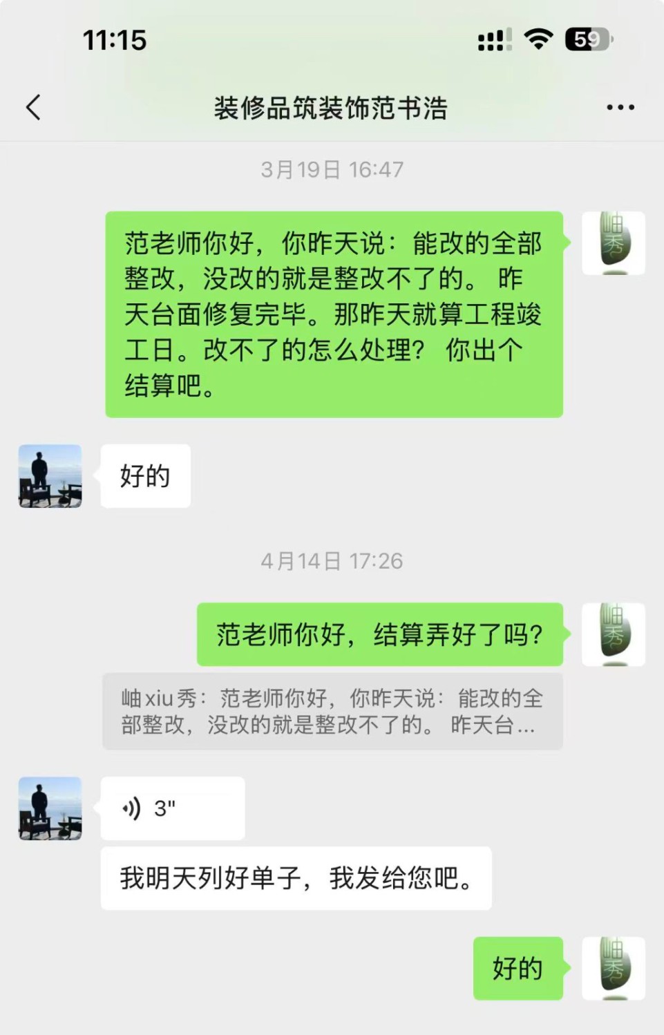 2026.4.14因未得到任何回复,再次要求范书浩出结算。