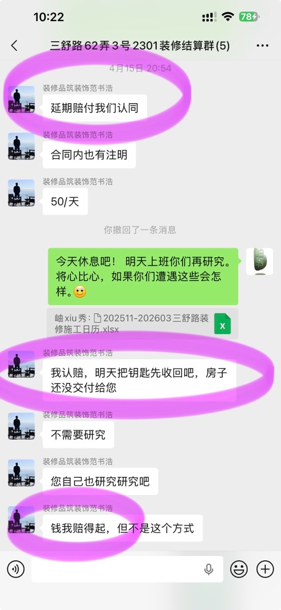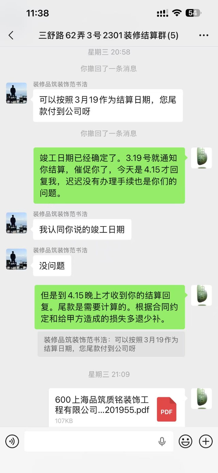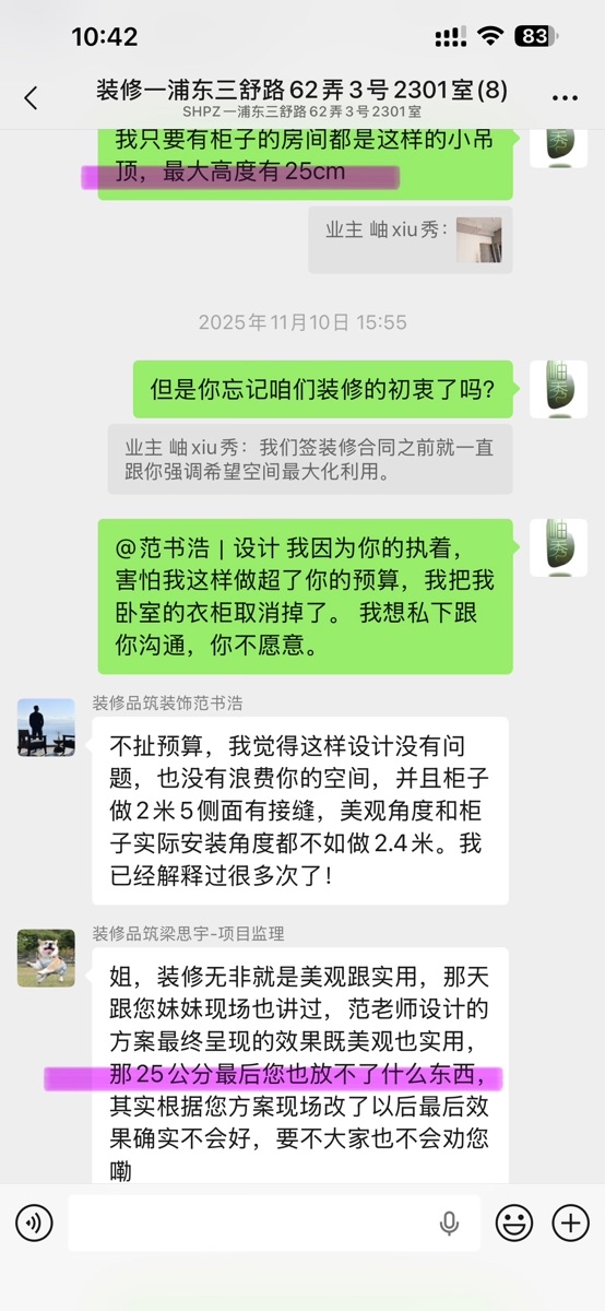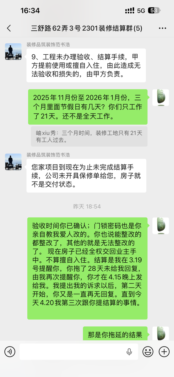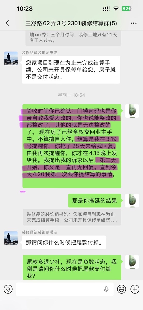2026.4.20晚上,在微信结算群,业主遭到品筑装装饰公司设计师范书浩、项目监理梁思宇威胁说房子未结算、尾款未付,法律意义上没竣工,就不能入住。让我搬出去等公司赔付。并嘲讽业主。业主遂决定寻求家装协会的帮助。