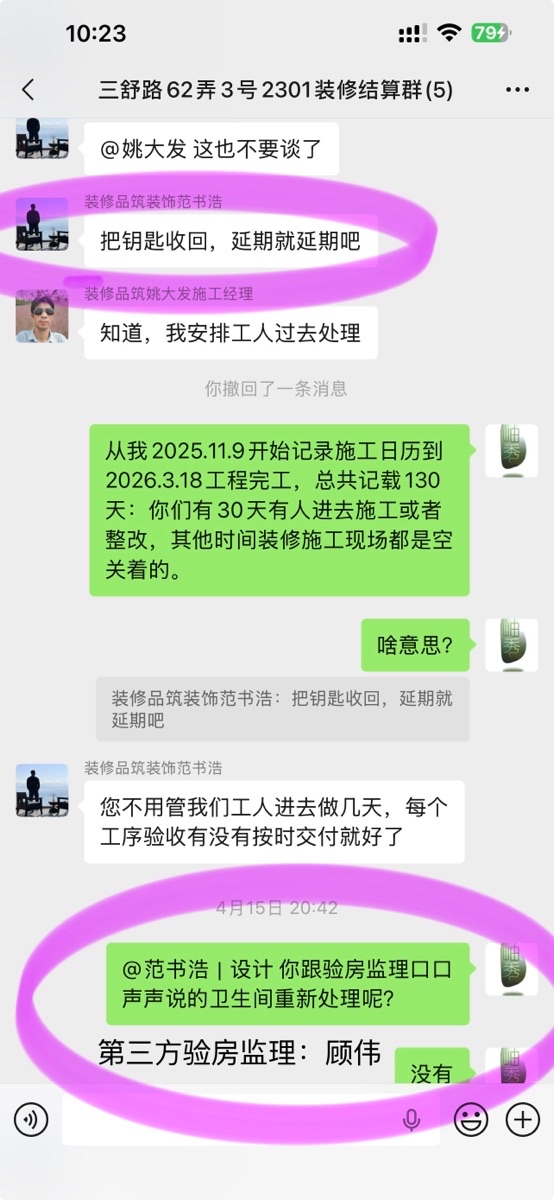 2026.4.15范书浩当时就表示不同意我的诉求,让工程经理来我家收回钥匙。后面就再未跟我联系。