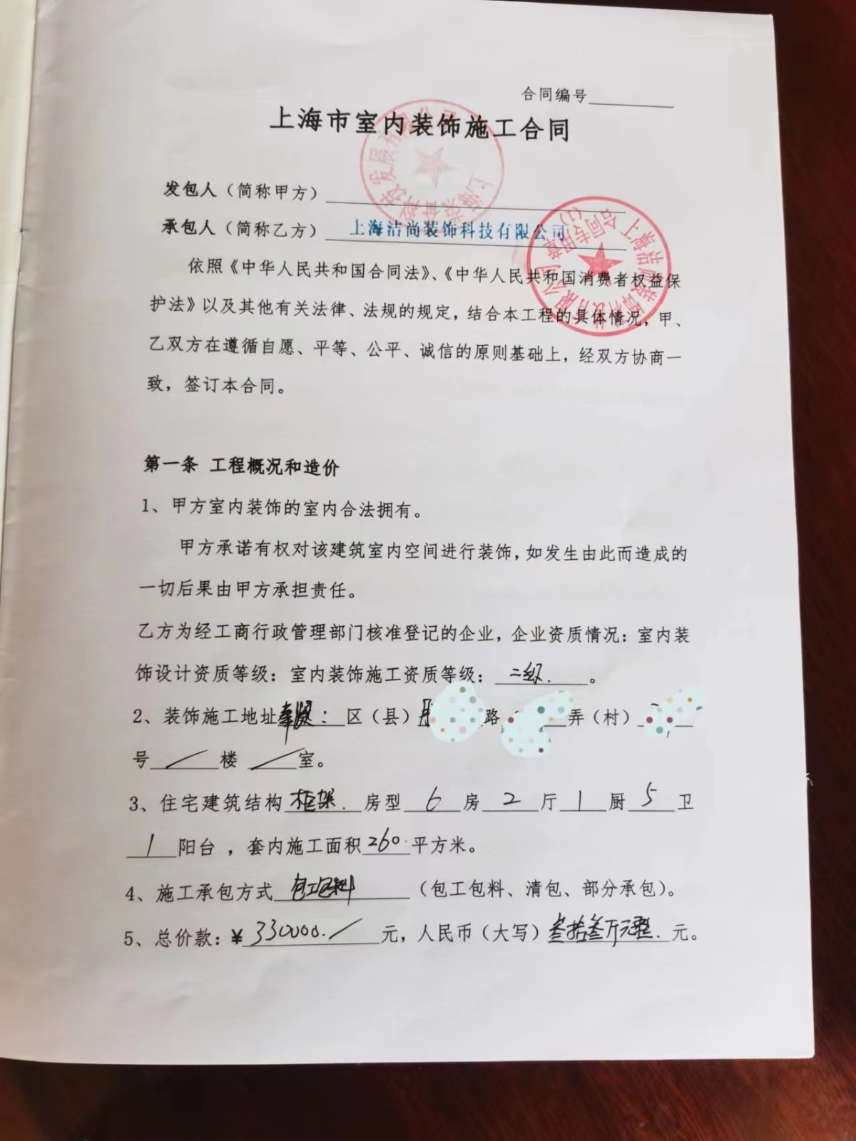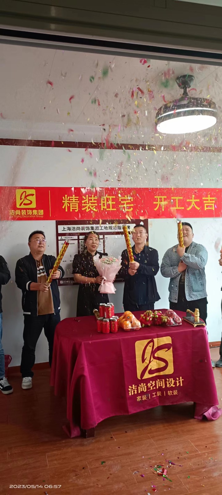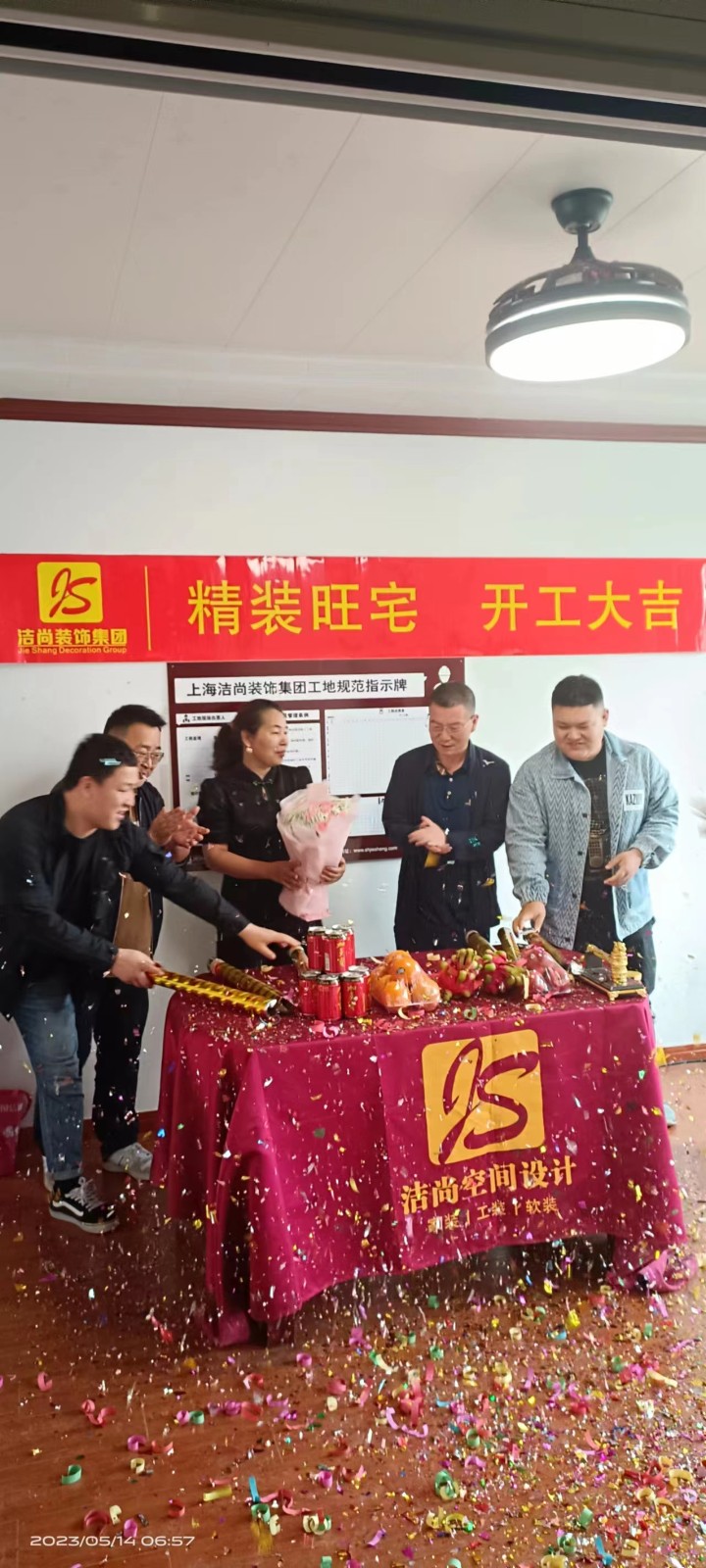 2023年5月5日业主孙先生跟上海洁尚装饰(集团)有限公司顺利签订合约,于5月14日早上7点进行开工仪式。附合同内容及部分效果图