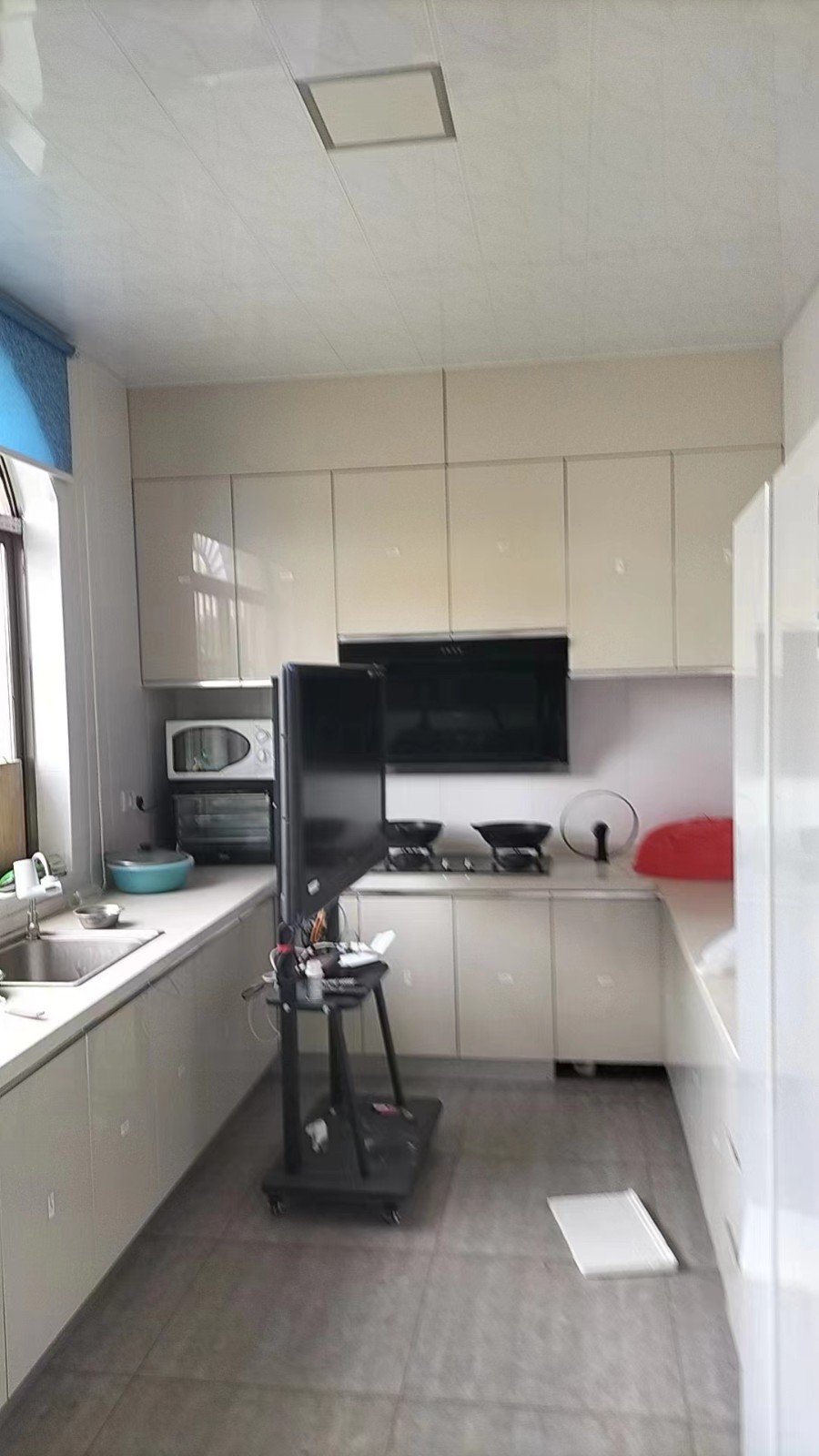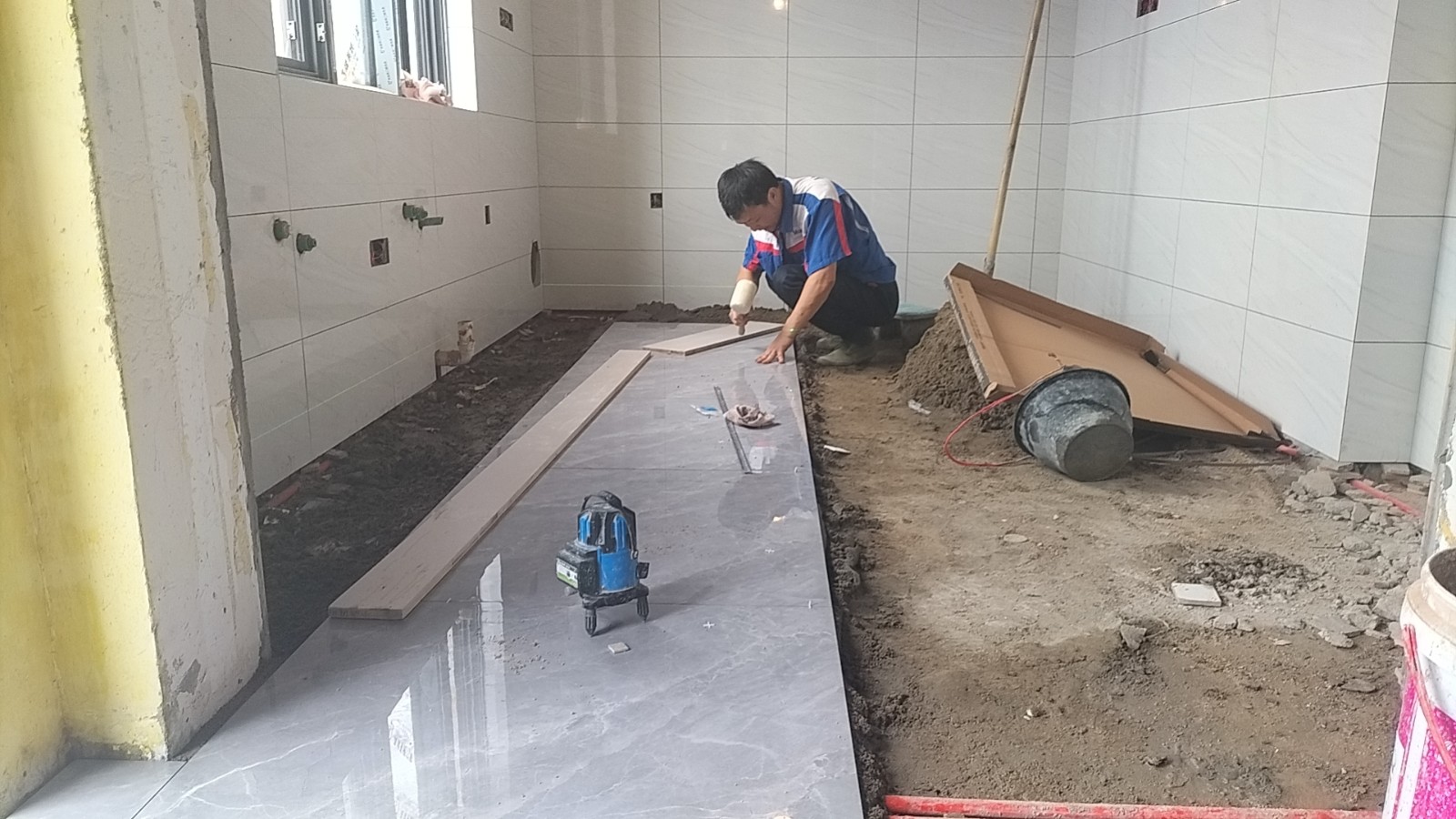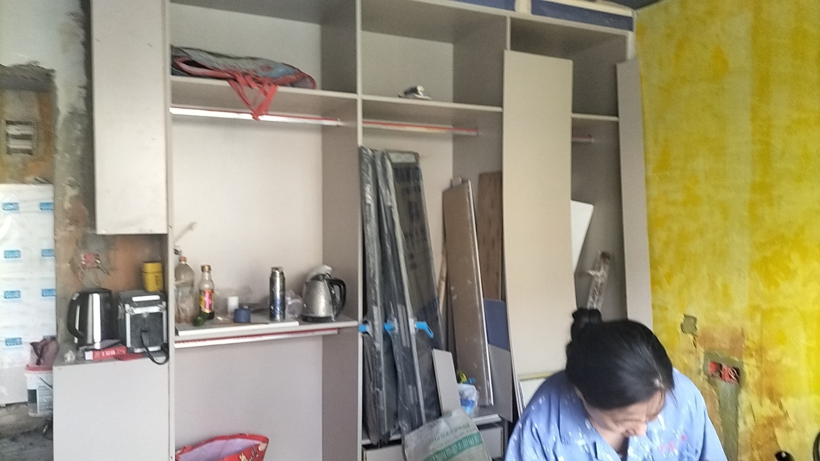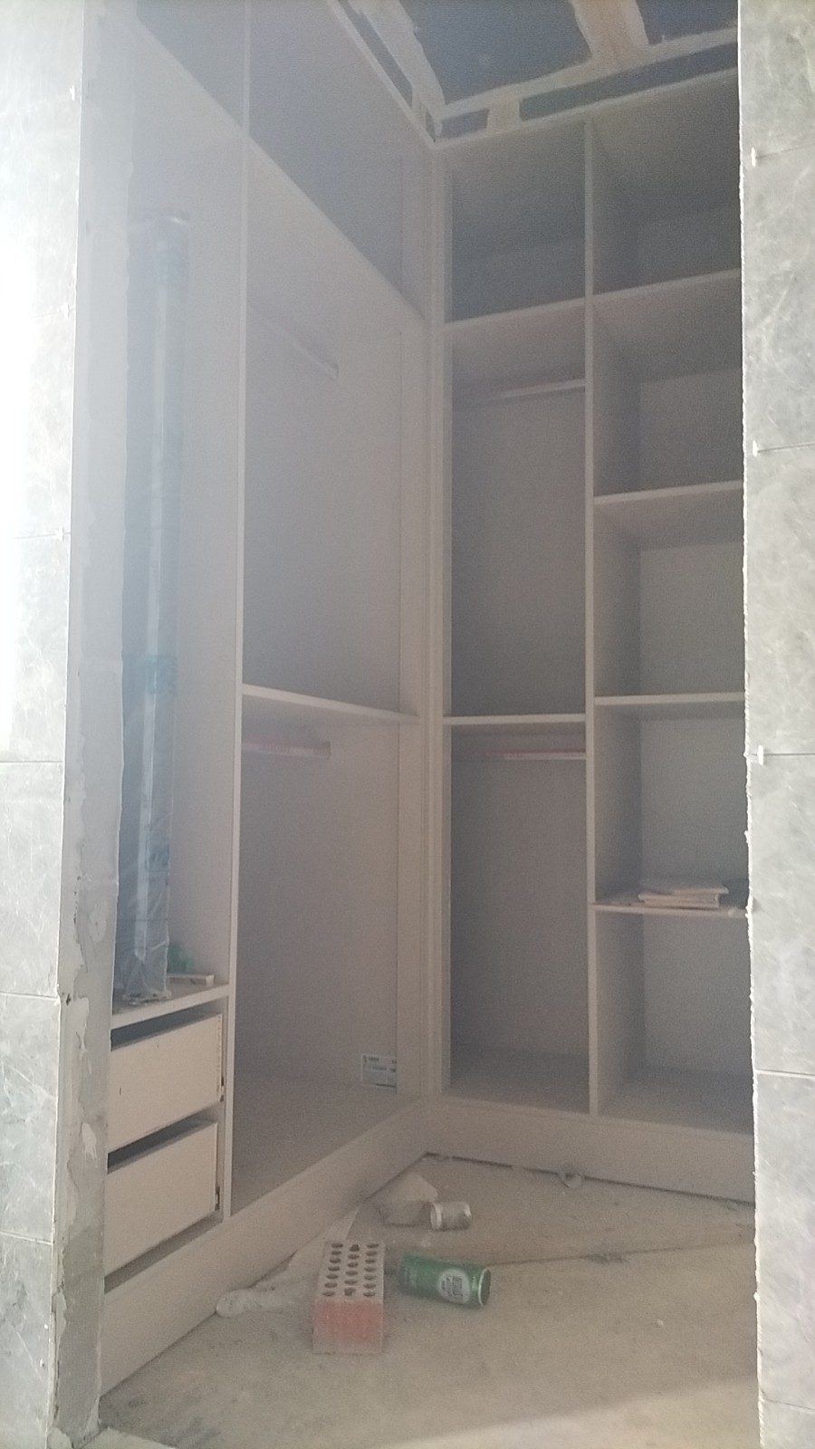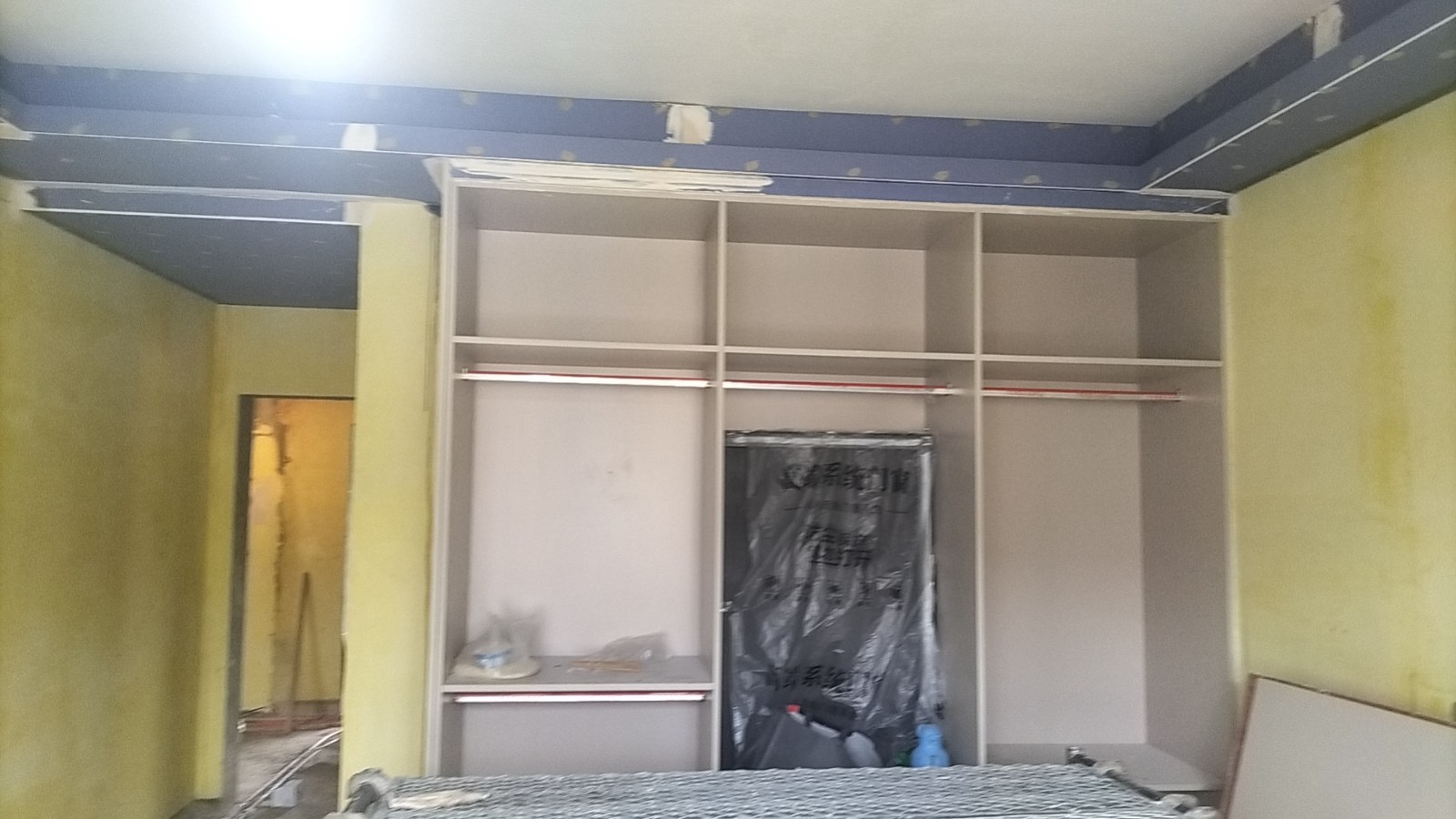 在顶着34℃的高温天气下,师傅们顶着高温天气的同时,用着他们专业的技术正一步一步的改造着业主心目中的家,厨房的白色瓷砖,显得即明亮又整洁。为了后期吊顶不会产生绣眼,石膏板吊顶全部用黑水泥家胶水全部粉刷。在已经铺好的地砖上铺上保护毯,防止后期产生划痕。衣柜全部采用木工现场定制。