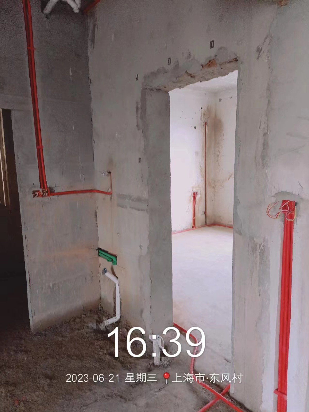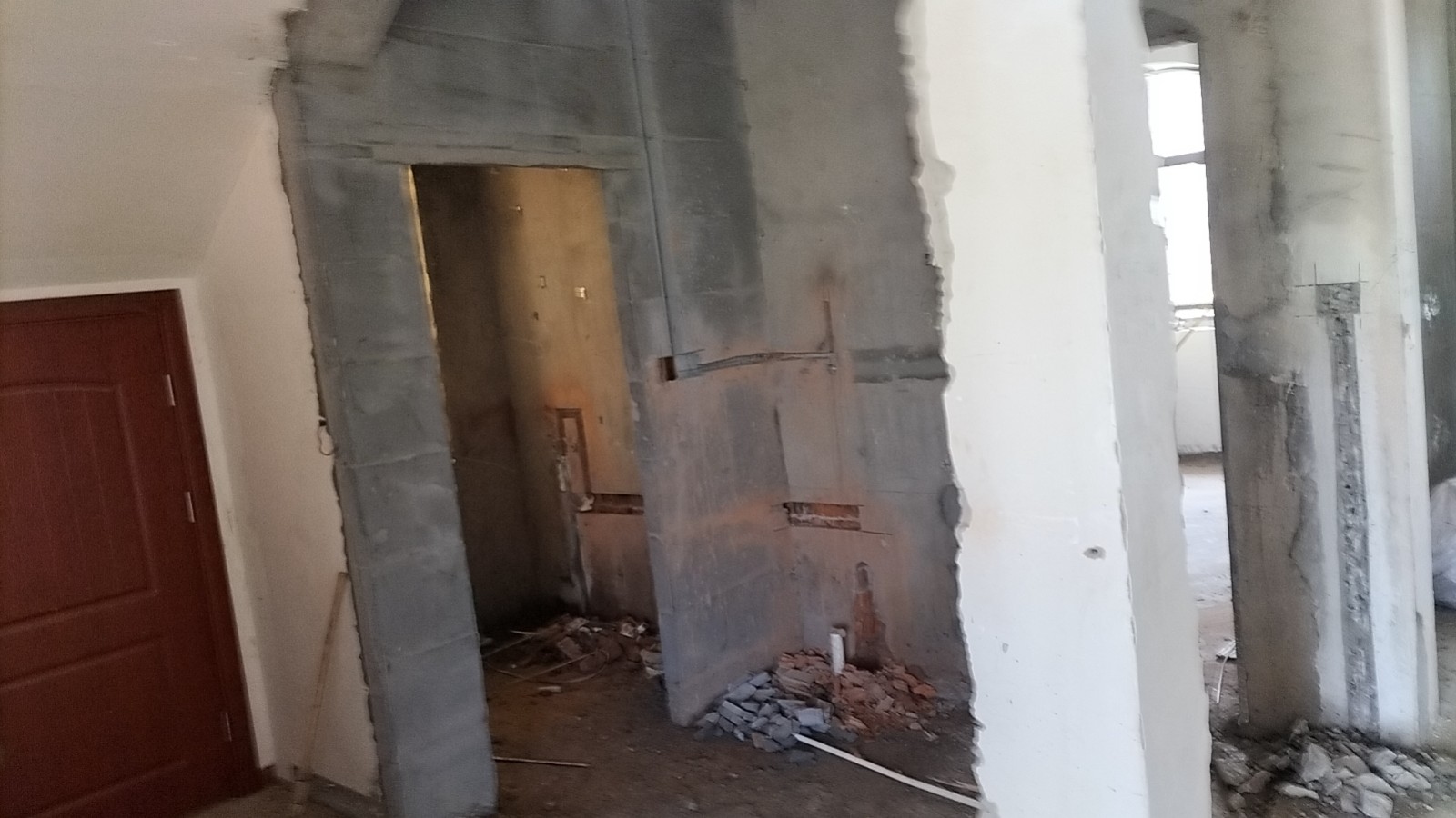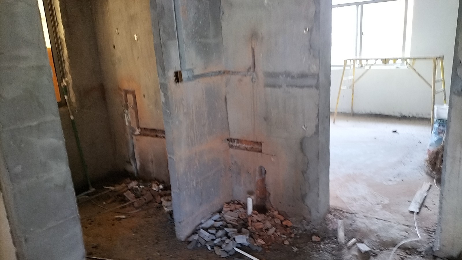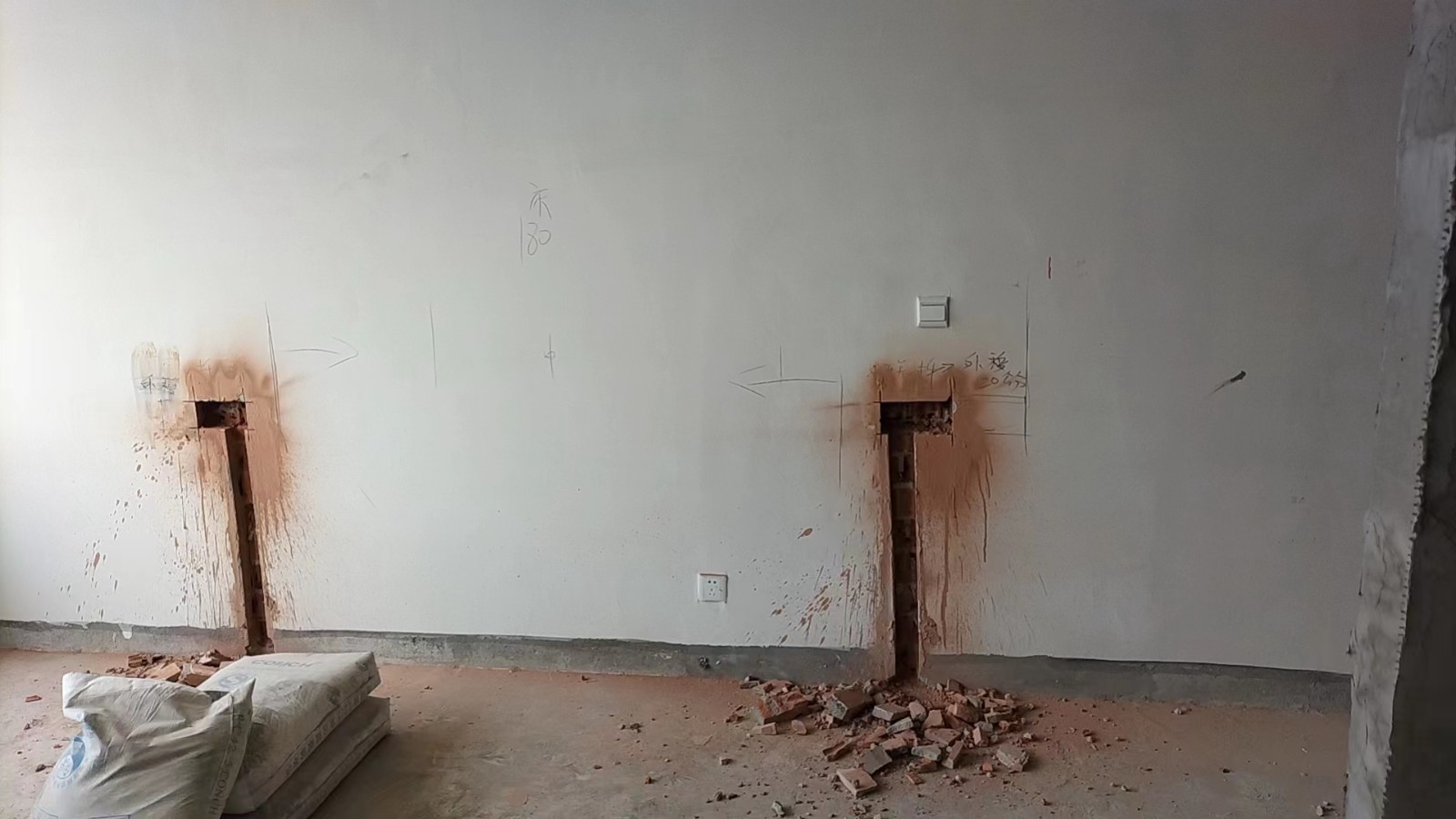 全部房间开槽已全部确定。业主将厨房原本的局改,到现在的决定全部拆除,拆完,就可以安排水电。