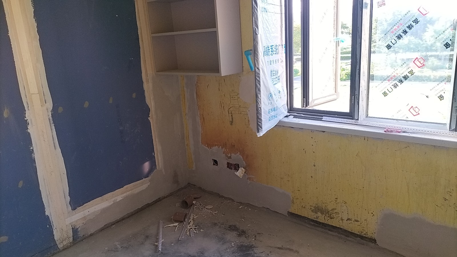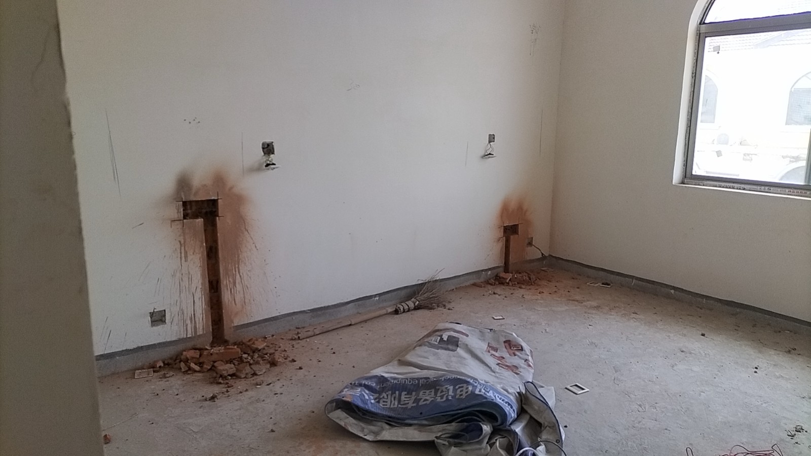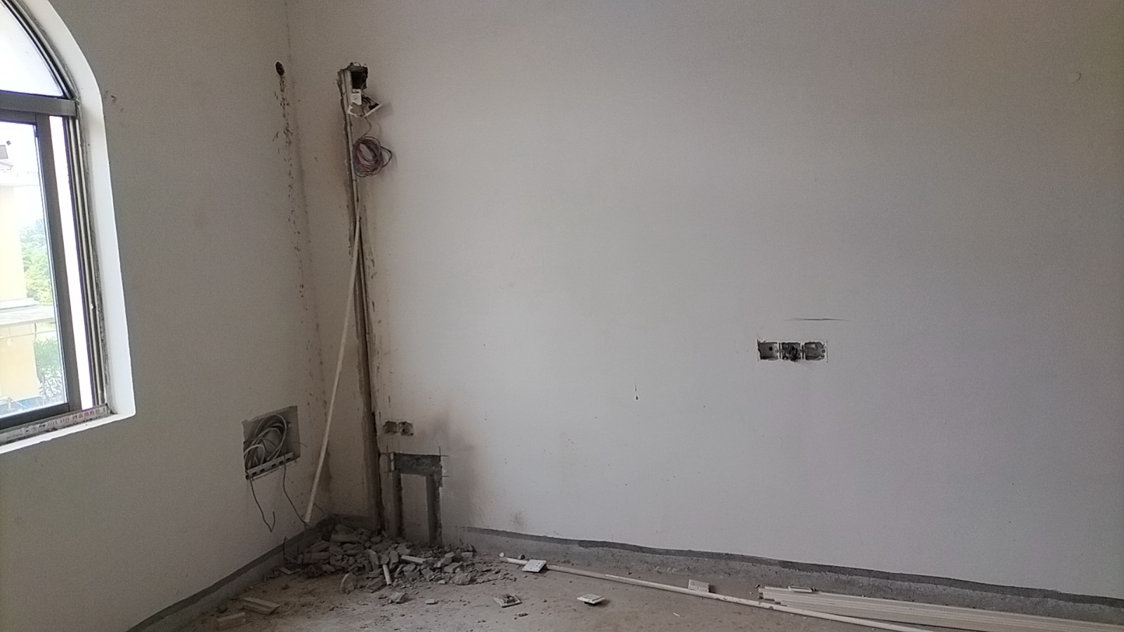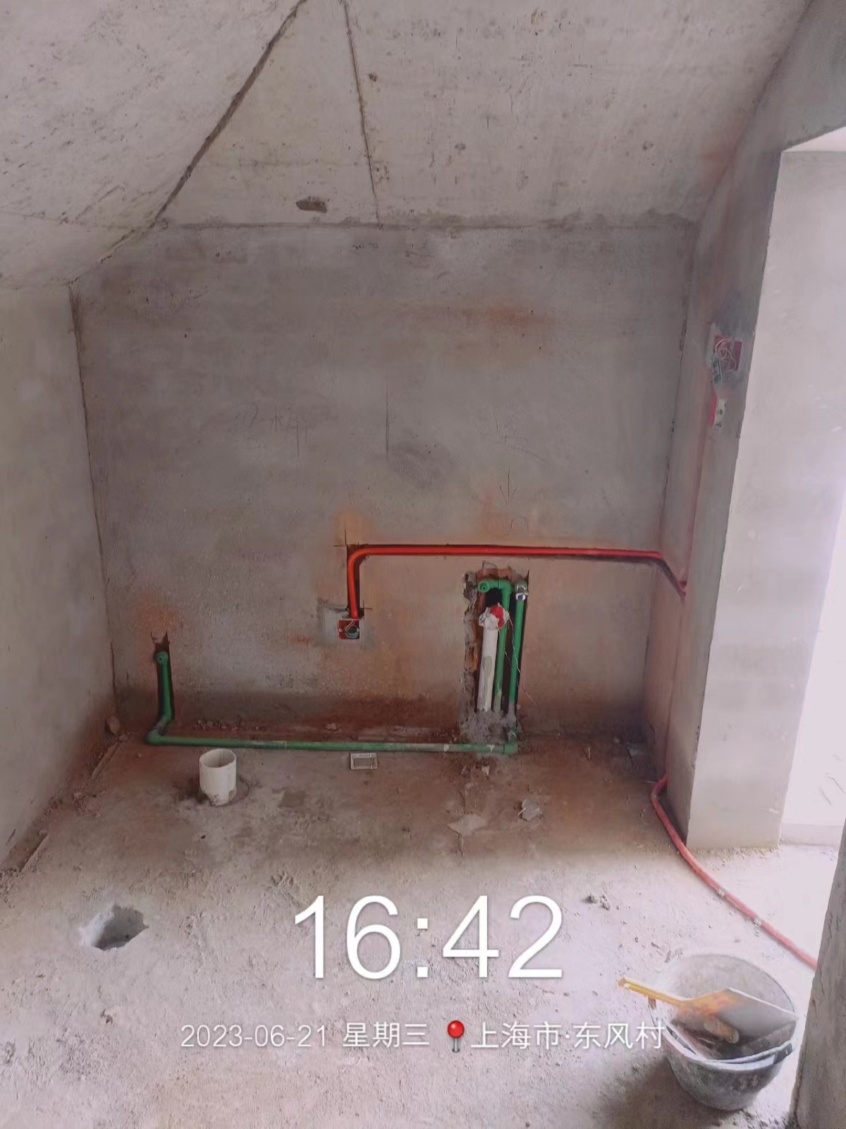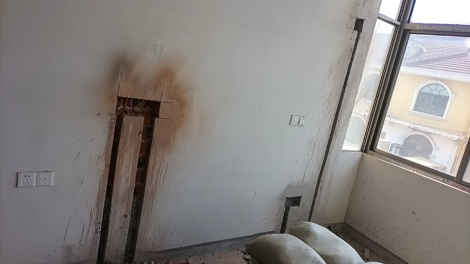 全部房间开槽已全部确定。业主将厨房原本的局改,到现在的决定全部拆除,拆完,就可以安排水电。