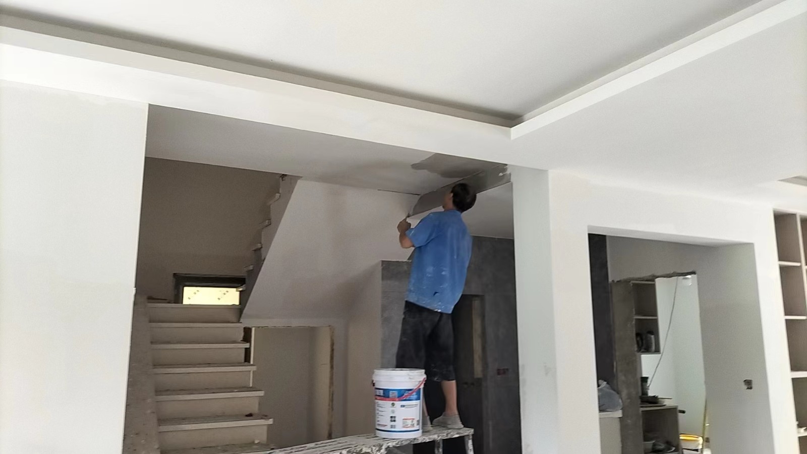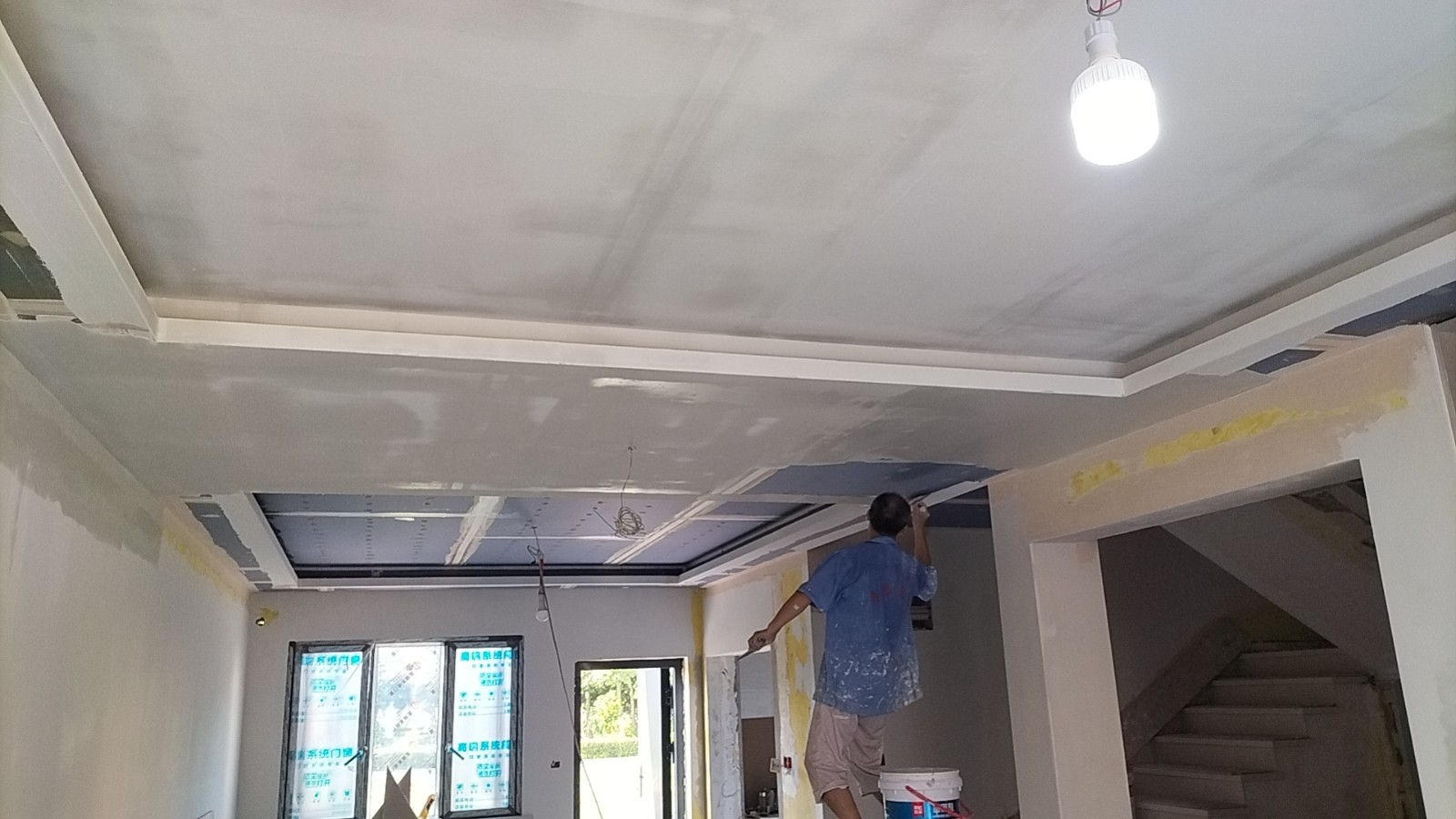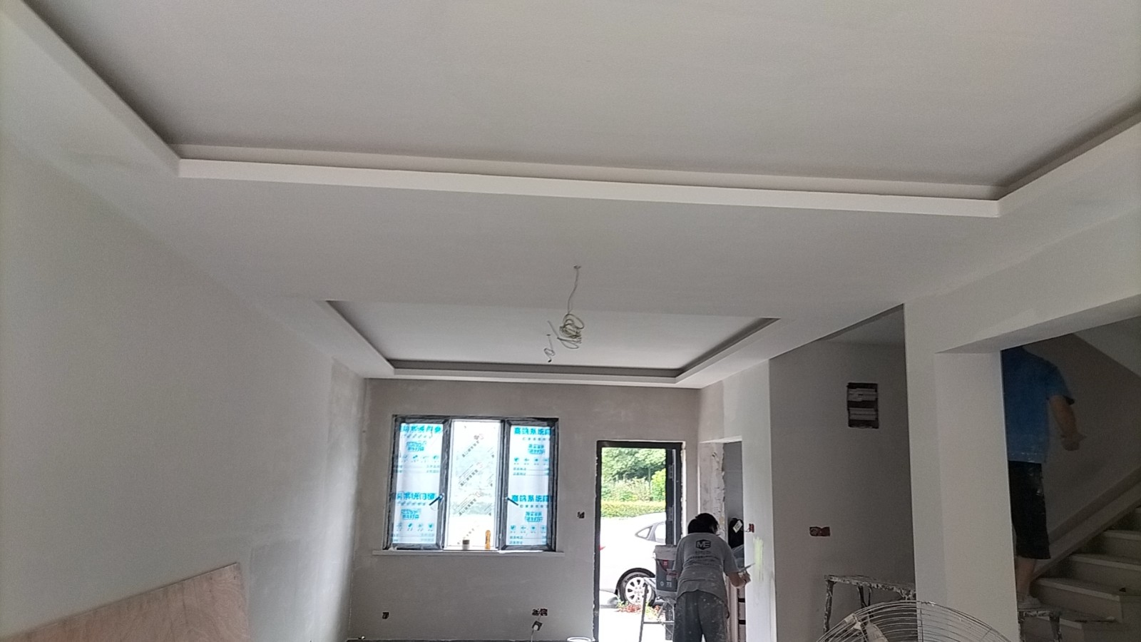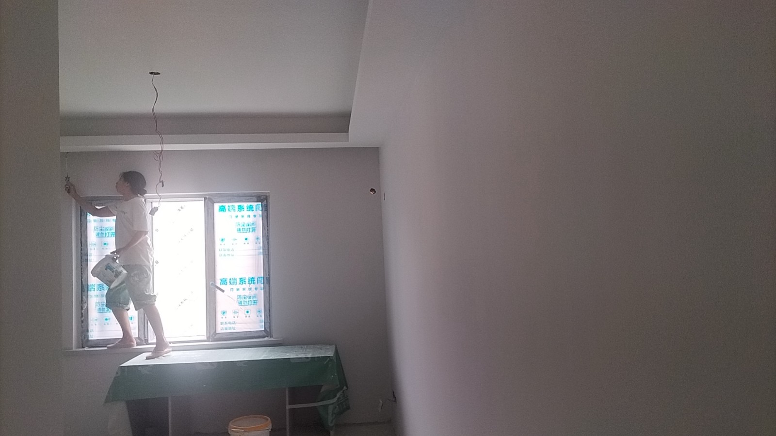 施工阶段:油漆阶段,第二遍乳胶漆完成,等待干透后刷第三遍。