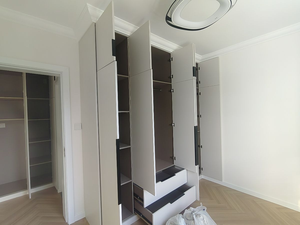 油漆工进场,全屋柜体保护好,正在进行满墙挂网格布批第一道腻子。