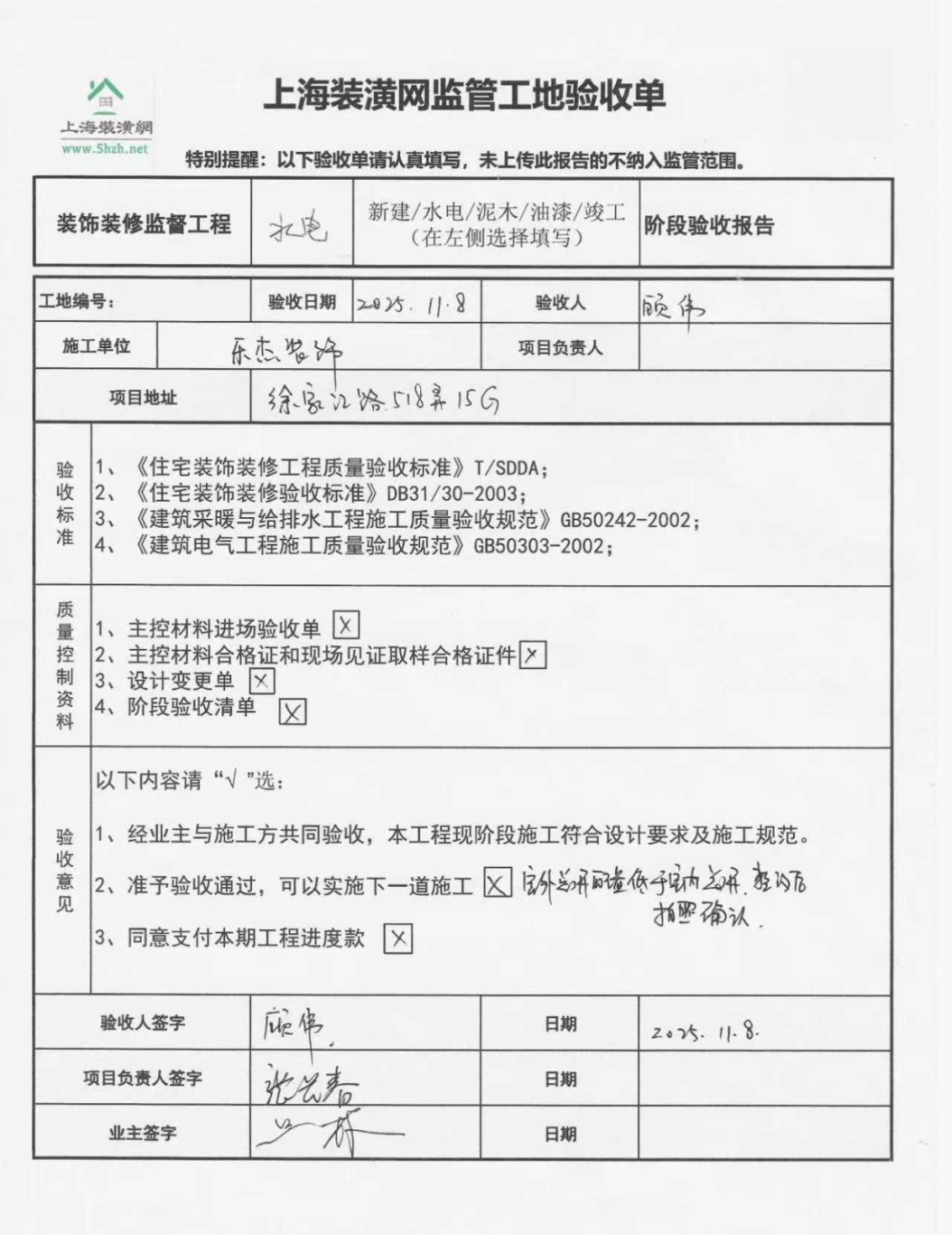 验收结论:经专业上门检测,本次水电工程施工质量基本符合《建筑电气工程施工质量验收规范》(GB 50303-2015)及《建筑给水排水及采暖工程施工质量验收规范》(GB 50242-2016)相关标准,局部区域需整改且拍照确认后方可通过全部验收。