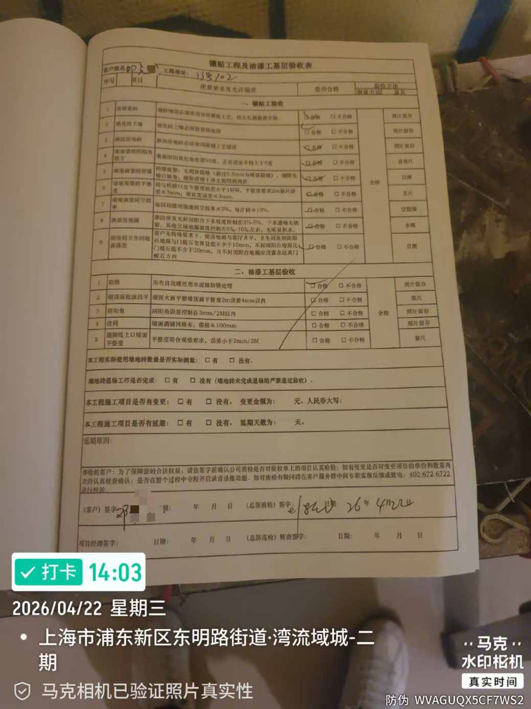 4月22日浦东邓先生家泥木工程顺利验收合格。知贤装饰工地实景验收,现场全面查验,瓷砖铺贴平整,缝隙均匀,排水坡度合理,防水施工达标,杜绝渗漏问题。木工吊顶与基层结构扎实稳固,边角收口干净整齐,各项工艺全部符合验收标准。