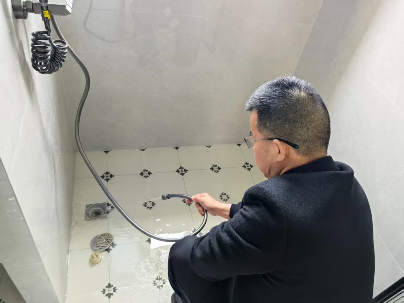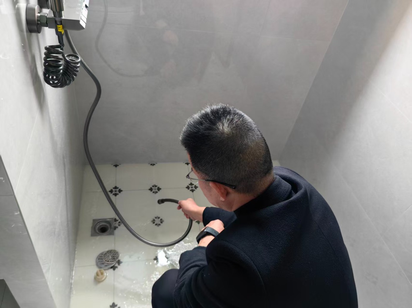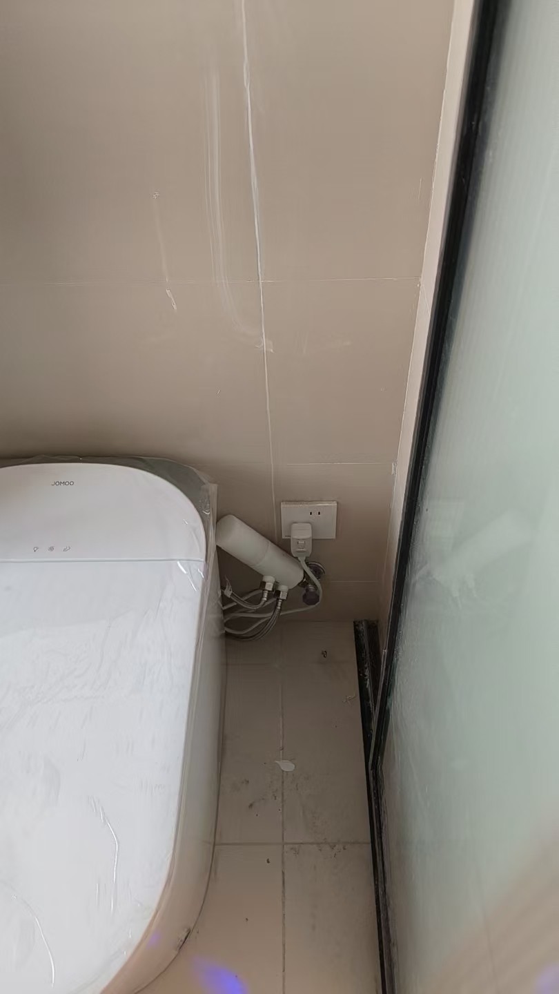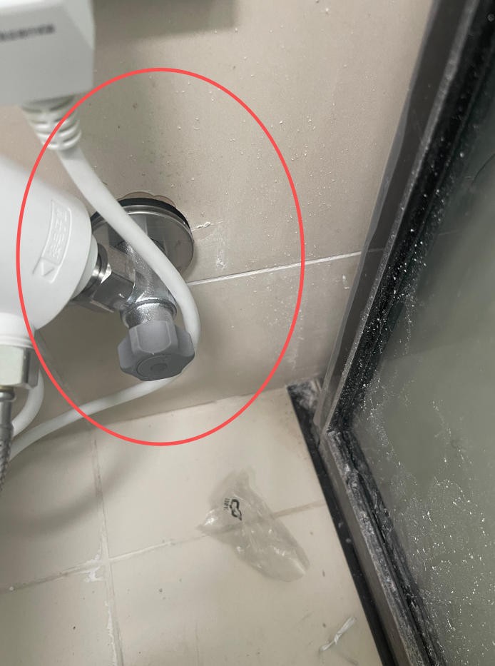 3.三角阀收胶:清除原有不密实胶体,选用防霉玻璃胶,沿三角阀与墙面接缝处均匀打胶,用工具刮平收边,保证胶面光滑顺直。