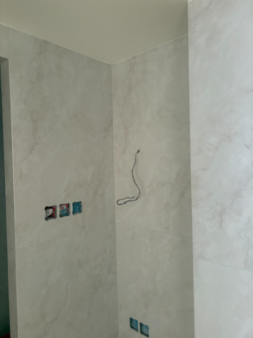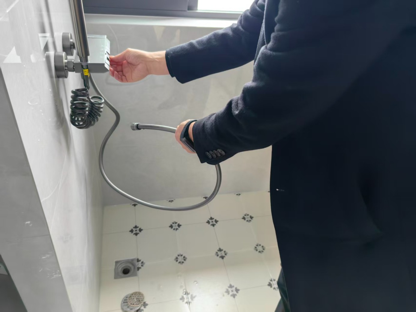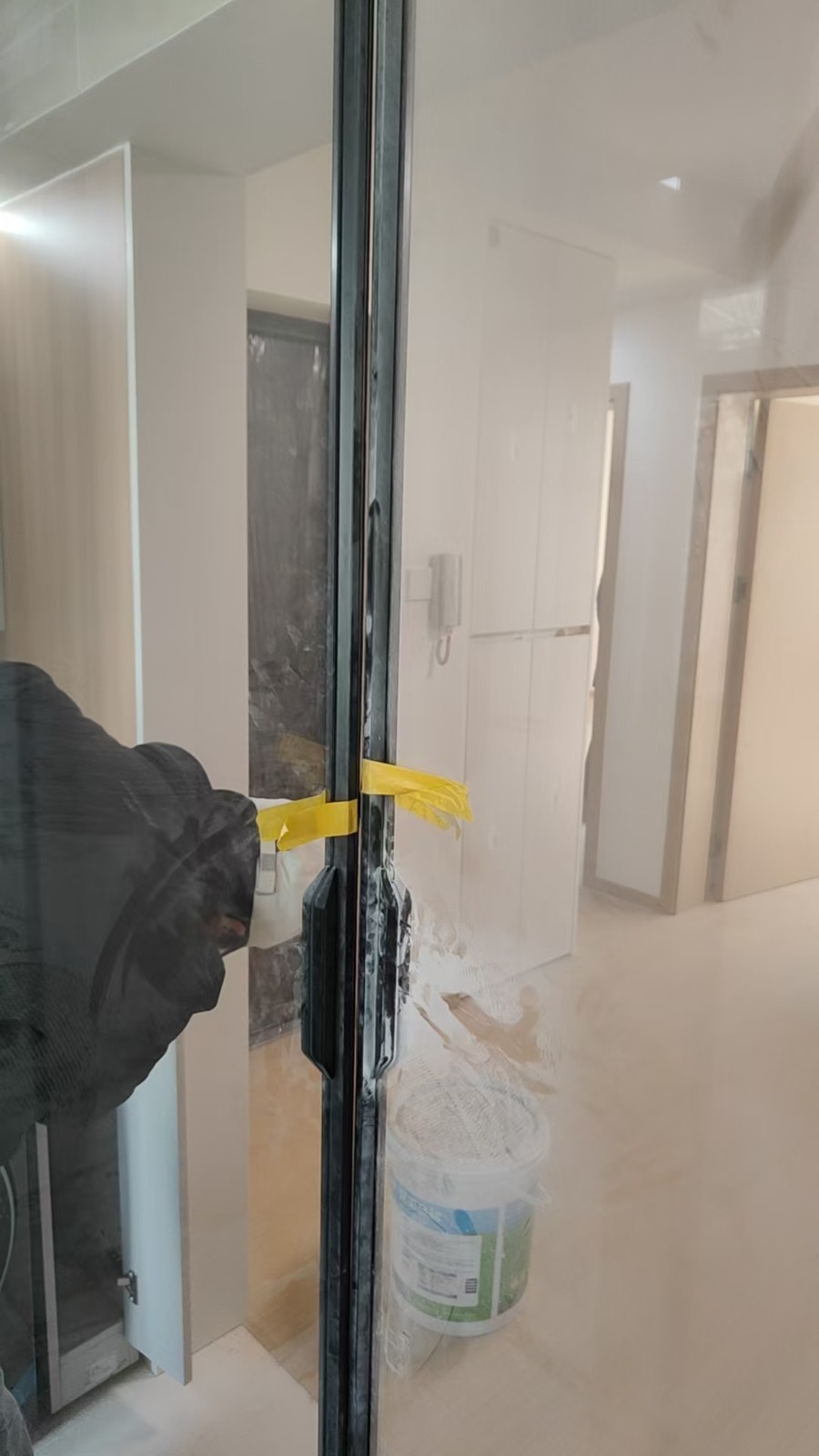 3.三角阀收胶:清除原有不密实胶体,选用防霉玻璃胶,沿三角阀与墙面接缝处均匀打胶,用工具刮平收边,保证胶面光滑顺直。