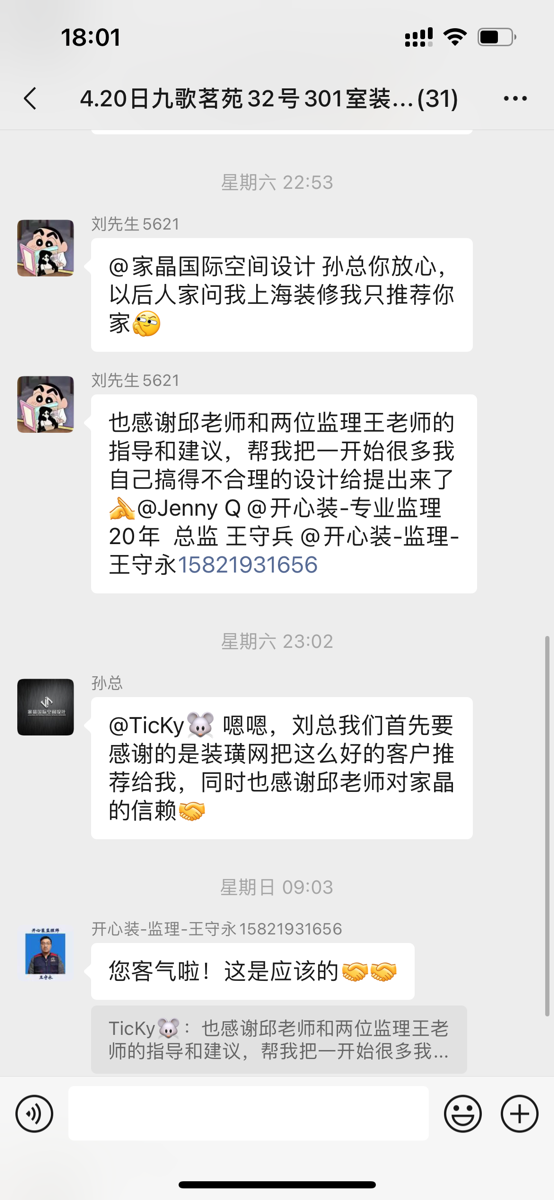 装修前能进入上海装潢网、认识邱老师是我的幸运,从合同审核、全程监督、资金监管到第三方监理,每一步都为完美收官做了铺垫。家装顺利的模式不一样,但悲剧的原因都是一样的,如邱老师所说:贪便宜的、迷信大品牌的、懒惰的。当装修业主成为待宰羔羊时,悲剧己注定。上海装潢网构筑了家装“防火墙”,撑起了业主“保护伞”,我会以我的亲身体验,向周边有需求的朋友和亲人强烈推荐上海装潢网!!!家中的装修工地播报到此结束,再次谢谢上海装潢网和家晶公司。