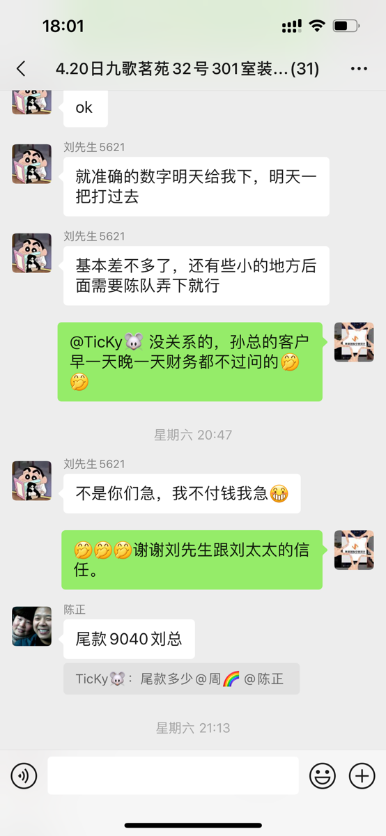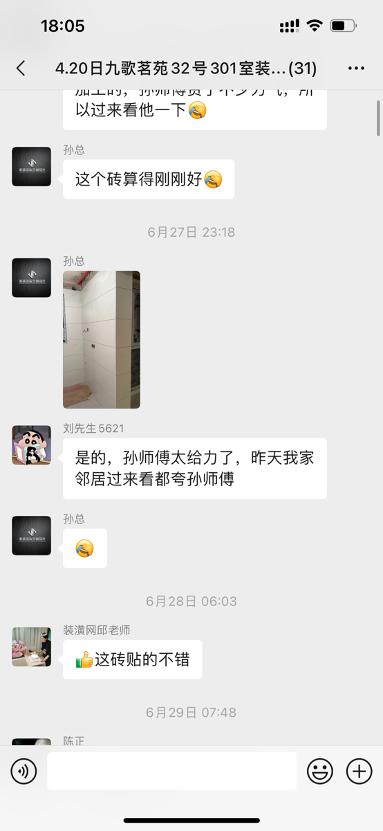 陈队非常靠谱,我提出的想法都能超预期落实,而且问题响应很快,基本在我去工地之前就能解决!木工吴师傅和瓦工孙师傅水品特别高!所有来我家参观的朋友都说家里装修好看!此外还感谢装修网的邱老师以及监理王老师的督促和指导!本次装修没踩坑没花冤枉钱!