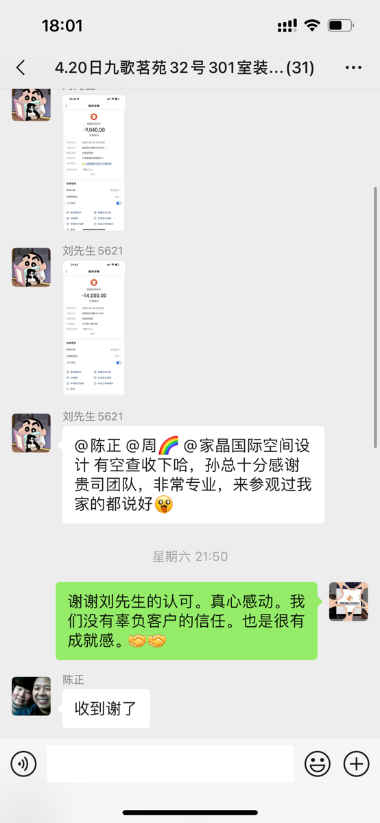 谢谢乐杰,也谢谢装潢网。现在装修结束,并已经竣工验收,乐杰各方的服务与付出,让我们收获了合意的新居。乐杰的设计师小贺根据我们的房子结构和要求,精心设计、耐心讲解方案理念,以我们比较纠结的性格,又几经修改方案,最终给出了更适合我家的设计。项目经理孙队,施工过程中特别注意和我们沟通,有问题及时解决,整个装修过程与孙队可以说合作愉快。店长Ada及时关注装修进展,我们有什么问题Ada都能够群里及时回应。整个装修时间安排紧凑,效果理想!