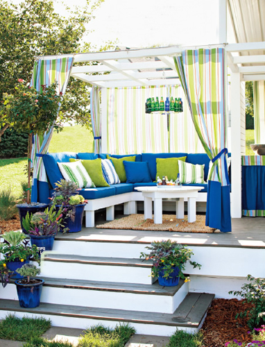 概要: 春天的色彩是丰富多彩的,最流行的莫过于白、蓝、绿三种色彩,三色打造一个春意凉亭式露台。它不仅会成为院子里的一道景观,也让你的户外生活更丰富、更惬意!