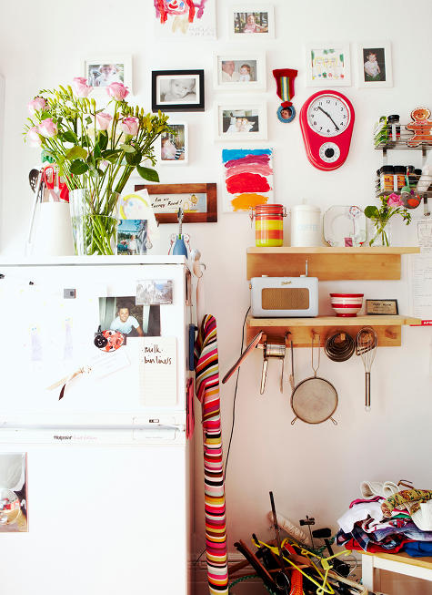 厨房的空间不够,冰箱摆在客厅里,这一面墙既是装饰用也是收纳空间,正在厨房的旁边生活也很方便。