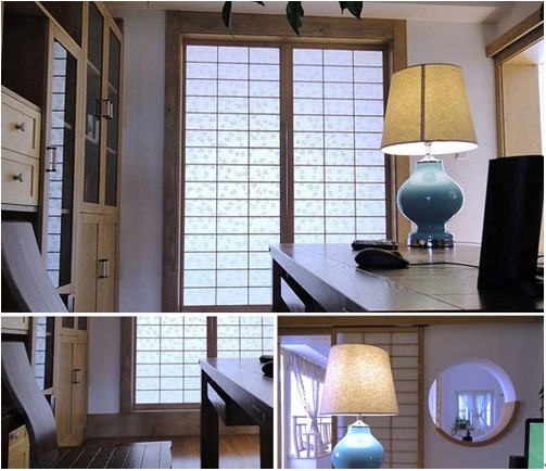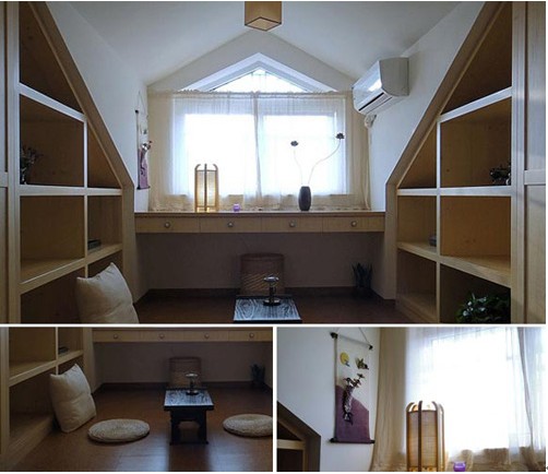 书房整个设计都未离开过原木。原木色的门框、书架,都体现了雅致书房风采,一点点的日式风格。中式的榆木书桌椅,时尚简约的花瓶身台灯。日式门后是书房的茶室,看书工作之余在里面泡上一壶茶,品着茶的清香,去除一身的倦容。