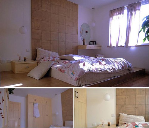 卧室仍然是原木色为主调,门/背景墙/矮柜/化妆台均已原木选材,简约而环保。大大的窗户,飘逸的窗帘,充足的自然光,盈满卧室,整个室内空间显得大而通透,绿植盆栽,则增添一丝清新。