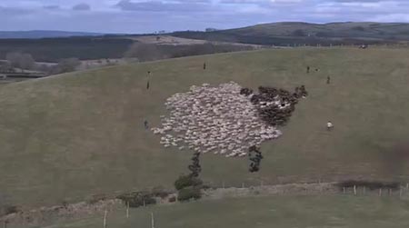 这段视频中,牧羊人指挥牧羊犬,驱赶羊群,拼出羊、游戏、焰火甚至蒙娜丽莎图案。