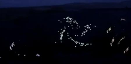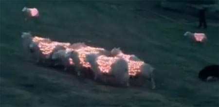 画面上,一只牧羊犬身披发光二极管“外套”,奔上山坡,像一团焰火蹿上漆黑的夜空。突然,预先“埋伏”在山坡上的羊群四散,身上的发光二极管“外套”同时亮起,宛如烟花绽放。