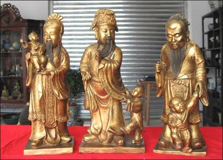 (2)福禄寿三星:“福星”手抱小儿,象征有子万事足的福气。“禄星”身穿华贵朝服,手抱玉如意,象征加官进爵,增财添禄。“寿星”手捧寿桃,面露幸福祥和的笑容,象征安康长寿。福禄寿三星中,本来只有“禄星”才是财神;但因为三星通常是三位一体,故此福、寿二星也因而被人一起视为财神供奉了。倘若把福、禄、寿三星摆放在财位内,有这三星拱照,满堂吉庆,撇开风水不谈,单是视觉上及心理上也会觉得十分舒服的。担任文职的,以及受雇打工的人均宜摆放或供奉文财神;至于那些经商做老板,以及当兵当差从事武职的人,则应该摆放或供奉武财神。