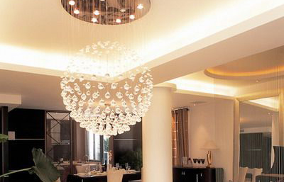 客厅是待人接客的场所,要求营造一种温暖热烈的氛围,因此客厅以选用庄重、明亮的吊灯或吸顶灯为宜。如果房间较高,宜用白炽吊灯或一个较大的圆形吊灯,这样可使客厅显得通透,但不宜用全部向下配光的吊灯,而应使上部空间也有一定的亮度,以缩小上下空间亮度差别。灯具的造型与色彩应与客厅的家具摆设相协调。