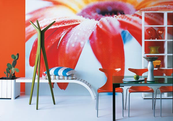 以曲线和色彩装点房间各个角落。左起,内层为锌质缸盆的花盆架(cm45×45×43高,215欧元),与弧形的Adamo长凳相连(cm178×38×45高,390欧元,整体设计以白色上漆的野生松木为材质,Pircher出品),条纹靠垫(Linum出品,约25.40 欧元/个)。HI!绿色白桦木挂衣架,颜色还有紫红色、樱桃色和黑色(Pascal Tarabay设计,Diamantini&Domeniconi出品,cm55×55×172高,300欧元起价)。同样为绿色的水晶桌面,黑色涂层的钢制结构,桌子的尺寸和颜色都可以选择,同样也可以根据需要加长长度(这里的尺寸:cm140×80×76高,966欧元)。红色Delfy椅子,外壳为光亮的工程塑料材质(Gino Carollo设计,Ciacci Kreaty出品,有各种颜色选择,144 欧元/把)。桌面上,白色陶瓷的 Zurbaran水果盘(Studio Sigla设计,Terre Blu出品),细颈陶瓷瓶和小篮子(Sardegna Lab出品)。后面,用Wall to Wall组合模式制作的漆木书架(Poliform出品,这里的尺寸:cm105×32×197高)。架子上,两个Dalu'灯的新版造型(Vico Magistretti 1965年设计,Artemide出品,59欧元/个),陶瓷花瓶(Luca Scacchetti设计,Terre Blu出品,140欧元)。采用Gerbera面料的巨幅墙布装饰(Jannelli&Volpi出品,Magic Walls系列,共8块装饰布,整体尺寸cm372×270, 405.60欧元)