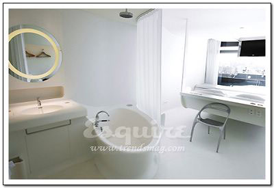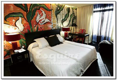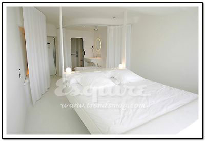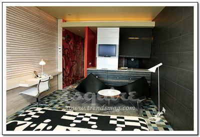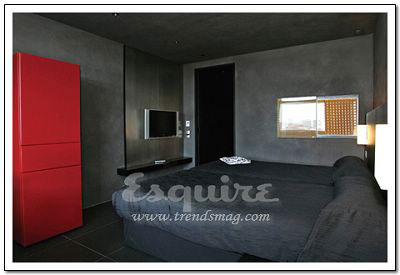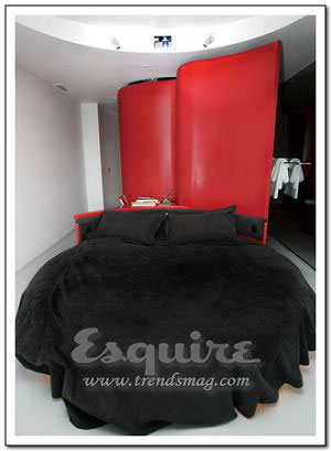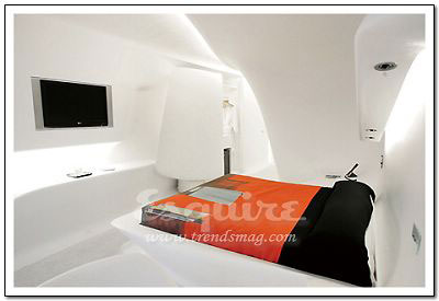 深处其中最大的感觉:流动。Zaha.Hadid在这套房间中以数字设计的新发展为基础,用流畅但不规则的墙壁线条,体现了空间流动性的特色,好像一个漂亮的模具。最不起眼的关键所在:电视机下的白色遥控器。它控制着屋内所有内嵌在墙壁内的尖端数字设备,从激光灯到数字电视。最值得学习的搭配:橘黄色镶黑的现代主义印花床单。