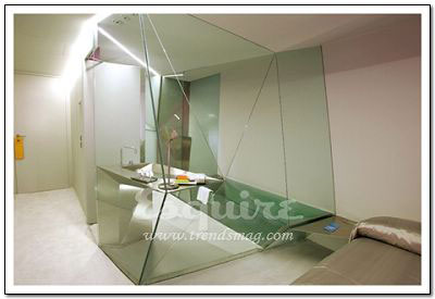 最另类的玻璃利用哲学:一扫卧室在人们心中只是安静的休息场所的形象,尝试充分利用玻璃的反射效果来营造变幻莫测的阁楼空间效果。最具伪装效果的家具:你发现浴缸了吗?仔细看看洗手池的后面。最大胆的颜色选择:把床单搞得像调色板一样的复杂很简单,但那叫恶俗而不是大胆,最大胆的颜色选择莫过于这间屋子床上的亮银色,这才叫真正的大胆。