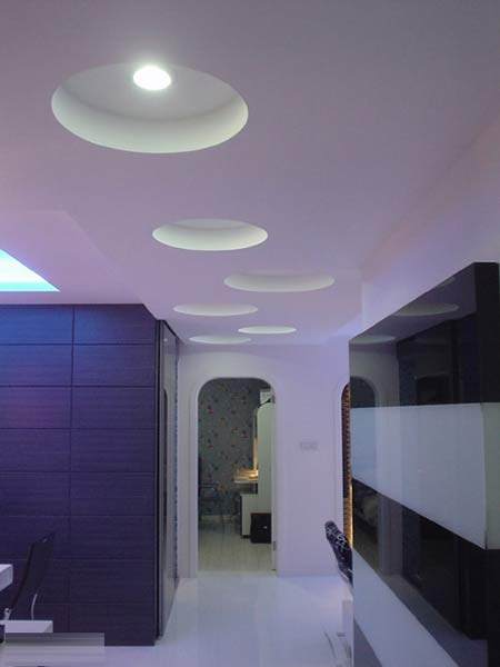 吊顶宜有天池。现在许多楼层从地面到天花板不足2.6米,如果吊顶必然会显得压抑,影响气的流通而令居住者产生不适的感觉,进而影响到日常生活和工作的情绪。假天花为迁就屋顶的横梁而压得太低,无论在风水方面或设计方面均不宜。对于这种情况,可采用四边低而中间高的天花造型,这样一来,不但视觉上较为舒服,而且天花板中间的凹位形成聚水的“天池”,对住宅大有裨益。若再在聚水的“天池”中央悬挂一盏金碧辉煌的水晶灯,则会有画龙点睛之效,但切勿在天花板上装镜,此乃风水大忌。
