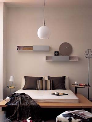 利落的线条充满整个房间,原木色的宽边床可移动的小几设计周到,背景墙上错落安置的CD架,利用材料的多元变化和几何造 型的有机融入,让视觉呈现出舒缓的起伏,金属衣架竖立要床旁,既实用又强调了空间的设计感