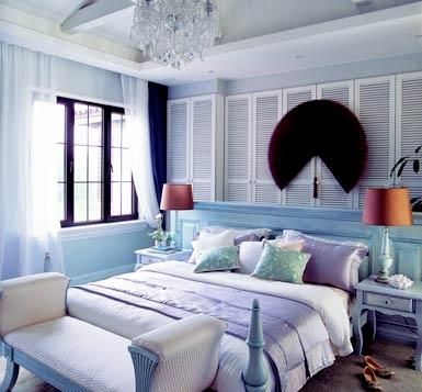 实用主义和浪漫主义可以在卧室中并存,蓝白色调浪漫而沉静,蓝色清透与白色的安静相互映衬,有着海一般的梦幻感觉,优雅的配色似如歌的行板,浪漫温馨,装点出如水一般纯净又内涵丰富的卧室氛围。蓝色的木质床头富于美感,被布艺包裹的床尾 小几,色调、风格与床气质和谐统一,既有对比度又有连贯性,整面墙的白色衣柜有整洁而实用的收纳功能。手感厚实富有光泽 的床品搭配大小不同的靠包,图案与色彩将卧室衬托得更空灵宁静,白色的窗纱轻柔摇曳,透过柔和的光线,身体完全回归到最 原始自然的状态。