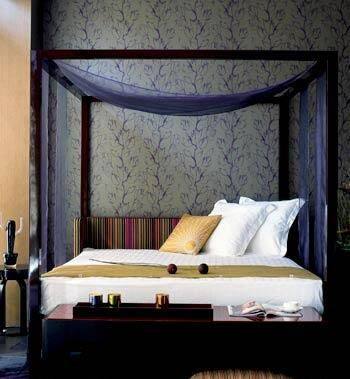 卧室中色调柔和的布艺床头庄重典雅而不乏轻松浪漫的感觉,与灰紫色暗花纹壁纸和深紫色的格纹地毯相互呼应,多层次的色彩变化,中和了深色家具带来的冷静,带有灰度的柔和色调让整个房间停留在雅致迷人的氛围里。