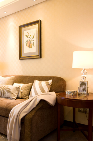 客厅空间小,设计师选择浅色,冷色调的墙纸,来创造一种宽敞、雅致的视觉效果。配上素净不张扬的壁画,给了客厅几分情调。米黄色的灯光,让房间披上了一间温馨的外衣,让来客感受到主人的真诚。浅咖色的靠垫与柔软的羊毛毯更添了几分舒适。边几上用黑贝母装饰盒和相框做装饰来凸显主人的品味。