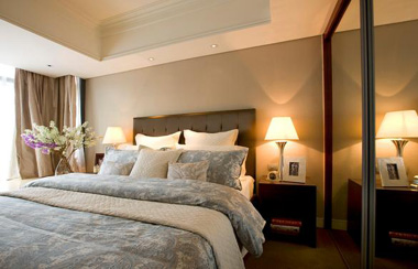 卧室依然大面积采用浅色调,浓咖啡色的床头柜和浓咖啡色的床,恰到好处的避免了卧室色彩的轻重失调。大面的镜子在视觉上大大增加了卧室的空间。床头柜上Harbor House白贝母相框和座钟,渗出一点高雅与脱俗。床头灯柔和的灯光又能让卧室不失温馨与亲切。