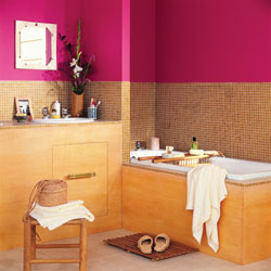 这个卫浴间有着现代和传统两种元素的痕迹,浴缸和面盆都是十分普通的,所用的马赛克和地砖种类也都是物美价廉的装修材料。但它们却用了大胆的相互结合的手法,墙的上半部采用十分强烈的红颜色,浴缸和面盆都用木贴面装饰,并以马赛克做镶边,饰品和辅助的家具运用传统的样式和材料,一间特殊味道的卫浴间就形成了。