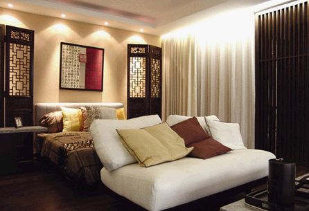 卧室的设计与家具配置最注重私密与舒适,在选配家具时要考虑居室墙面的颜色。墙面淡色调、家具可选用淡黄、白色,如家具颜色深,就不能用深灰的墙色,不然房间就没有精神了。新婚的房间,卧室颜色可以偏暖,增加欢乐的气氛,但不宜太艳。较小而缺少深度的房间,倘若挂上一幅有深度的风景画,或者装上一面镜子,即可造成一定的深度感。