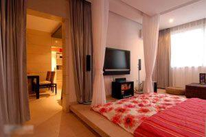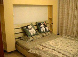 在摆放床的地域处,装修出10公分左右高的木质“地台”,相应地选用较低矮的床。其效果是:使睡眠区的环境更为清洁;地台烘托中的床与人更有一种“精品”的艺术美感;尤其是花梨木质的地台还可给人以芬芳的气息。