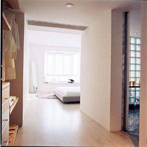 在床头一边或两边,距墙约二十到四十公分的位置,竖一块高大的板材,内藏床头灯,造成一个虚幻的空间,使床头部分更加富有扩张、神秘的魅力。
