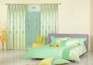卧室中既然以床为中心了,其它饰物一般就应有“退居二线”的衬托意识。如窗帘,面积较大,太艳、太豪华了,就会与床饰形成两个“中心”,以至让人眼花缭乱。故窗帘应选用相应一点儿的色彩、图案、面料,像一个“仆人”站在床边。