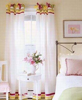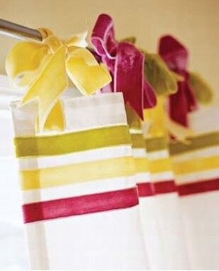 概要: 很多人为选窗帘发愁,只有好看的布料,却不知道如何独出心裁。不用跑到裁缝店,也能亲手制作出漂亮而具个性的窗帘装饰。 1。垂地吊带窗帘 3种不同的水果色调天鹅绒丝带使平白的布环窗帘变为雅致的装饰。 方法如下:放平窗帘,条纹丝带水平方向用织物胶水粘好。制作窗帘的顶部扣环,先把吊带剪下来,然后在每个窗帘上剪出6个间距相等,2。
