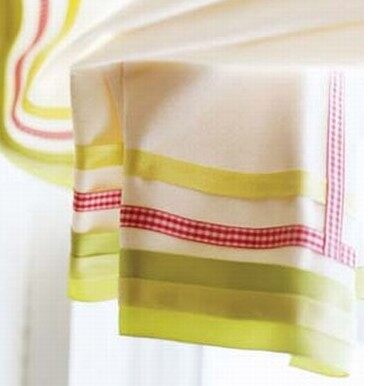 在这款罗马窗帘中将装饰品放在四周围会让窗帘看起来很整洁。当窗帘卷起,丝带装饰的边缘会呈现出优雅的窗帘褶。我们将不同宽度和颜色的丝带组合在一起。安排好设计后,将窗帘放置在一个平面上平整好,然后将丝带从窗帘的外沿开始一次一层地粘好。可以让丝带比窗帘的宽度长出2.5厘米,这样在最后完成时丝带就可以折一下粘在窗帘的背面。